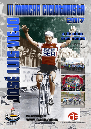 Ya está abierta la inscripción para participar en la tercera edición de la Marcha Cicloturista José Luis Viejo, que se va a celebrar el domingo 9 de abril. El precio es de 12 euros y el plazo finaliza a las 23:59 horas del 4 de abril. Las personas interesadas pueden formalizar su participación a través de internet en la página web www.joseluisviejo.com. Se prevé la participación de ex ciclistas profesionales.La prueba, que está organizada por la Peña Ciclista José Luis Viejo y el Ayuntamiento de Azuqueca de Henares, cubre una distancia de 98 kilómetros por la provincia de Guadalajara y tiene carácter no competitivo, excepto la subida a Robledillo, donde se instala una línea de meta para premiar a los tres más rápidos. La salida se ha programado a las 9:30 horas, desde la plaza de José Luis Viejo de Azuqueca, punto al que se regresa después de completar el recorrido.