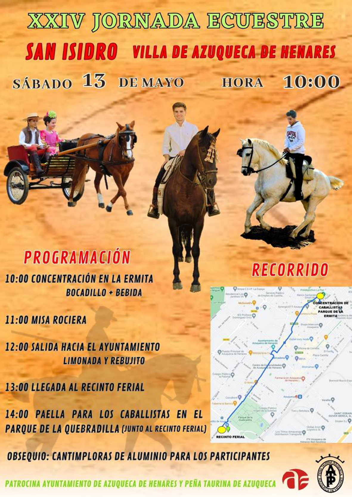 En cuanto al XXIV Día del Caballo, que organiza la Peña Taurina de Azuqueca con la colaboración del Ayuntamiento, la concentración y las inscripciones comienza a las 10 horas en el parque de La Ermita, que, a las 11 horas, acoge la Misa Rociera a cargo del grupo Sentir del Camino. Posteriormente, a las 12:30 horas, se inicia el recorrido hasta el Recinto Ferial, pasando por la carretera de Alovera, la avenida de Francisco Vives, la plaza de La Constitución –en los soportales del Ayuntamiento, la Casa de Andalucía de Azuqueca ofrece rebujito a los caballistas- y avenida de Alcalá.