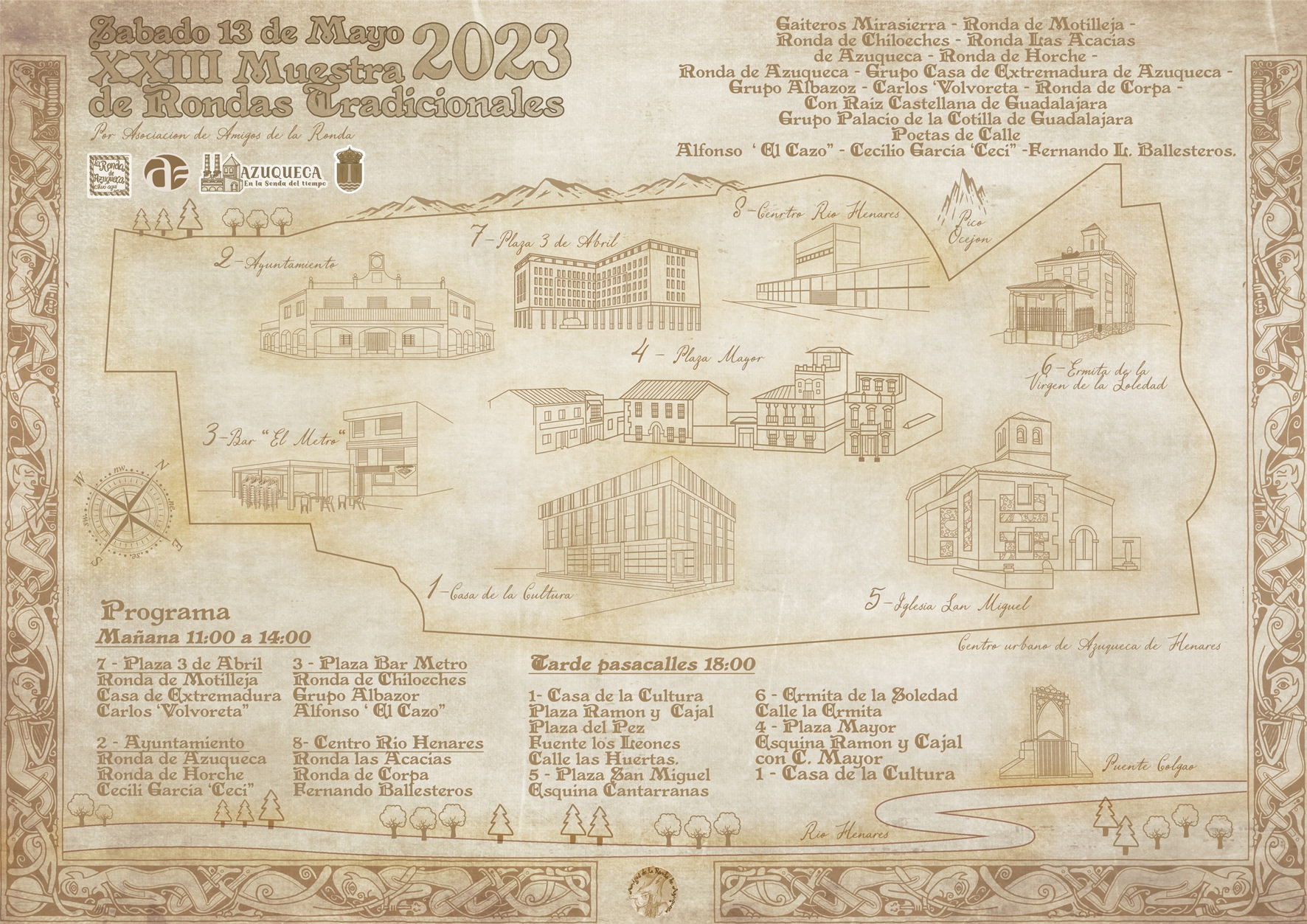 Chiloeches y Albazor y el poeta de la sierra Alfonso ‘El Cazo’ y los Gaiteros de Mirasierra; la plaza del Ayuntamiento, con la Ronda de Azuqueca, la Ronda de Horche y Cecilio Garcia ‘El Ceci’; la plaza de la Casa de la Cultura, con la Ronda de Motilleja, Casa de Extremadura y Carlos (Volvoreta) y, por último, en la plaza del General Vives con la Ronda de Las Acacias, la Ronda Corpa y Fernando Ballesteros.