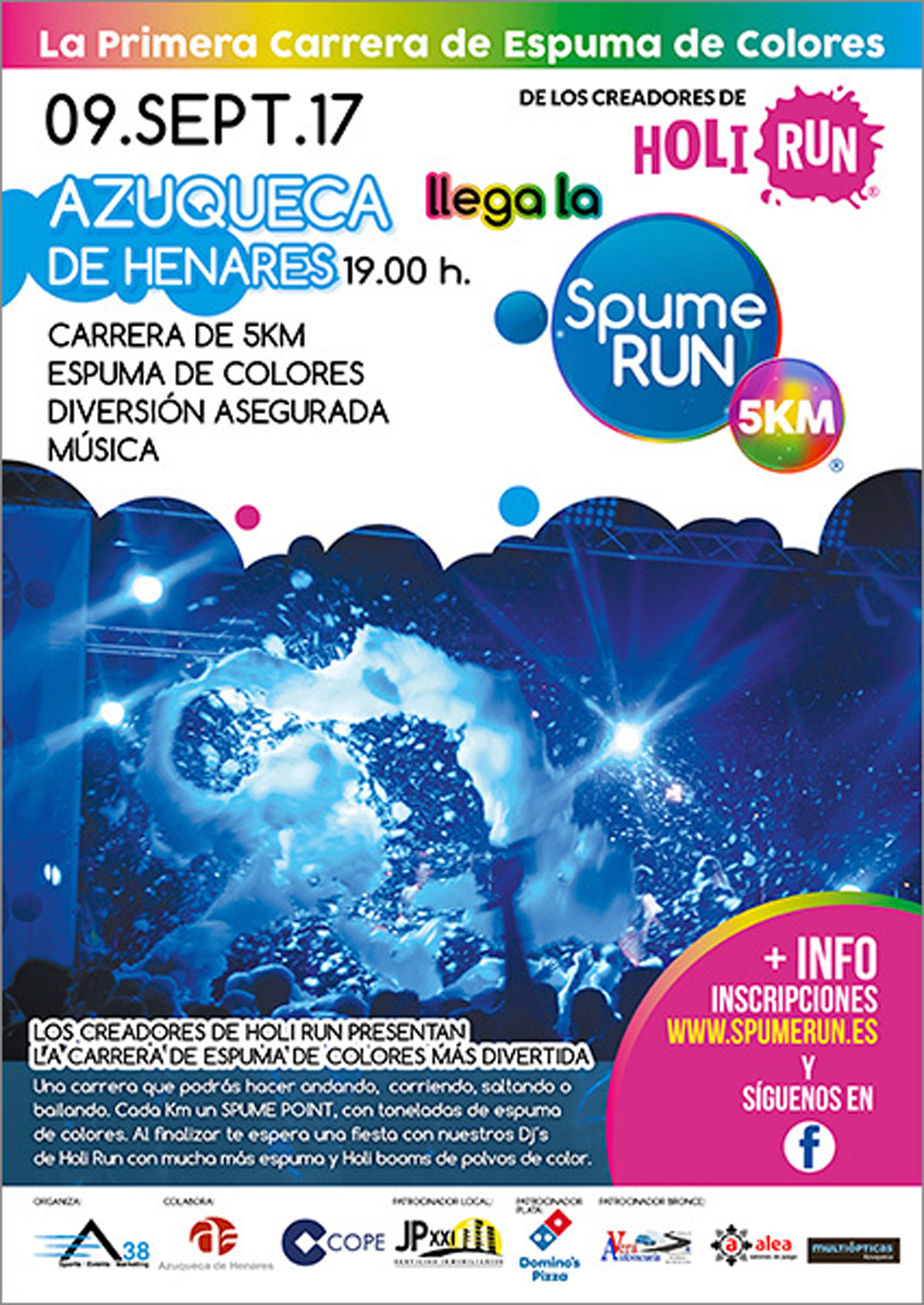 Como adelanto de las Fiestas de Septiembre, que se van a desarrollar entre el 16 y el 24 de septiembre, Azuqueca de Henares acoge este sábado, día 9, la Spume Run, "la primera carrera de espuma de colores que se celebra en Castilla-La Mancha", destaca la concejala de Fiestas, Charo Martín.La Spume Run, que se dirige a un público familiar y juvenil, contempla un recorrido de 5 kilómetros con salida y llegada en el Recinto Ferial. "La prueba está amenizada con música y cuatro denominados spume points, en los que se lanza espuma de color amarillo, verde, azul y rosa", explica la edil azudense. La carrera comienza a las 19 horas, aunque el recinto se abre a las 18 y acogerá actividades de animación y lanzamiento de espuma hasta la medianoche. Más información e inscripciones, pinchando AQUÍ.Regulación del tráficoDurante el desarrollo de la prueba, el tráfico de la ciudad se verá restringido (pinche AQUÍ para ver el listado completo de calles afectadas). "Con el fin de evitar situaciones de riegos y garantizar la seguridad de los participantes, los vehículos no podrán circular por las calles contempladas en el recorrido, así como en las vías colindantes", explica la concejala de Fiestas, Charo Martín, quien matiza que "para reducir las molestias, el recorrido se ha dividido en cinco tramos y, cuando los corredores completen cada uno de ellos, operarios municipales de Limpieza, apoyados por la barredora, despejarán las vías para que la circulación se pueda restablecer cuanto antes". Pinche AQUÍ para ver el mapa del recorrido.El primer Open de Fútbol-Chapas Azuqueca 'Sara Fuentes' (sábado 9, de 16 a 21 h., y domingo 10. de 9 a 14 h., en el polideportivo La Paz), así como una misa solemne en el parque de La Ermita con motivo del 50 aniversario de la imagen actial de la Virgen de la Soledad (domingo 10, 11:30 h.) completan los actos prefestivos del este fin de semana.Otras propuestas de ocio
