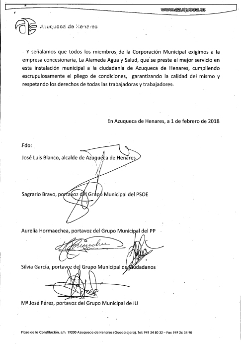 Ante los graves hechos ocurridos en las últimas semanas en torno a la gestión de la instalación municipal de piscina cubierta de Azuqueca de Henares, en los que se han registrado graves ataques por parte de uno de los empleados de la empresa concesionaria, La Alameda Agua y Salud, contra uno de los miembros de esta Corporación Municipal.D. José Luis Blanco Moreno, alcalde de Azuqueca de Henares, en representación de los Grupos Políticos Municipales de PSOE, PP, Ciudadanos e Izquierda Unida, quiere manifestar lo siguiente:- Condenamos de forma rotunda y contundente cualquier agresión, física o verbal, contra los miembros de la Corporación Municipal, en el ejercicio de su legítima representación de las vecinas y los vecinos de Azuqueca de Henares. Las concejalas y los concejales están protegidos constitucionalmente para realizar con libertad y garantías su labor de defensa del interés público de aquellos a quienes representan como cargos electos.- Solicitamos respeto escrupuloso para el trabajo fiscalizador de todos los miembros de la Corporación Municipal. Considerando intolerable cualquier tipo de acción que tenga como objetivo coaccionar o amedrentar a cualquiera de los integrantes de la Corporación del Excelentísimo Ayuntamiento de Azuqueca de Henares.- Informamos de que desde este Ayuntamiento se ha iniciado el expediente de responsabilidad contractual contra la empresa concesionaria para garantizar el mejor servicio.- Y señalamos que todos los miembros de la Corporación Municipal exigimos a la empresa concesionaria, La Alameda Agua y Salud, que se preste el mejor servicio en esta instalación municipal a la ciudadanía de Azuqueca de Henares, cumpliendo escrupulosamente el pliego de condiciones, garantizando la calidad del mismo y respetando los derechos de todas las trabajadoras y trabajadores.