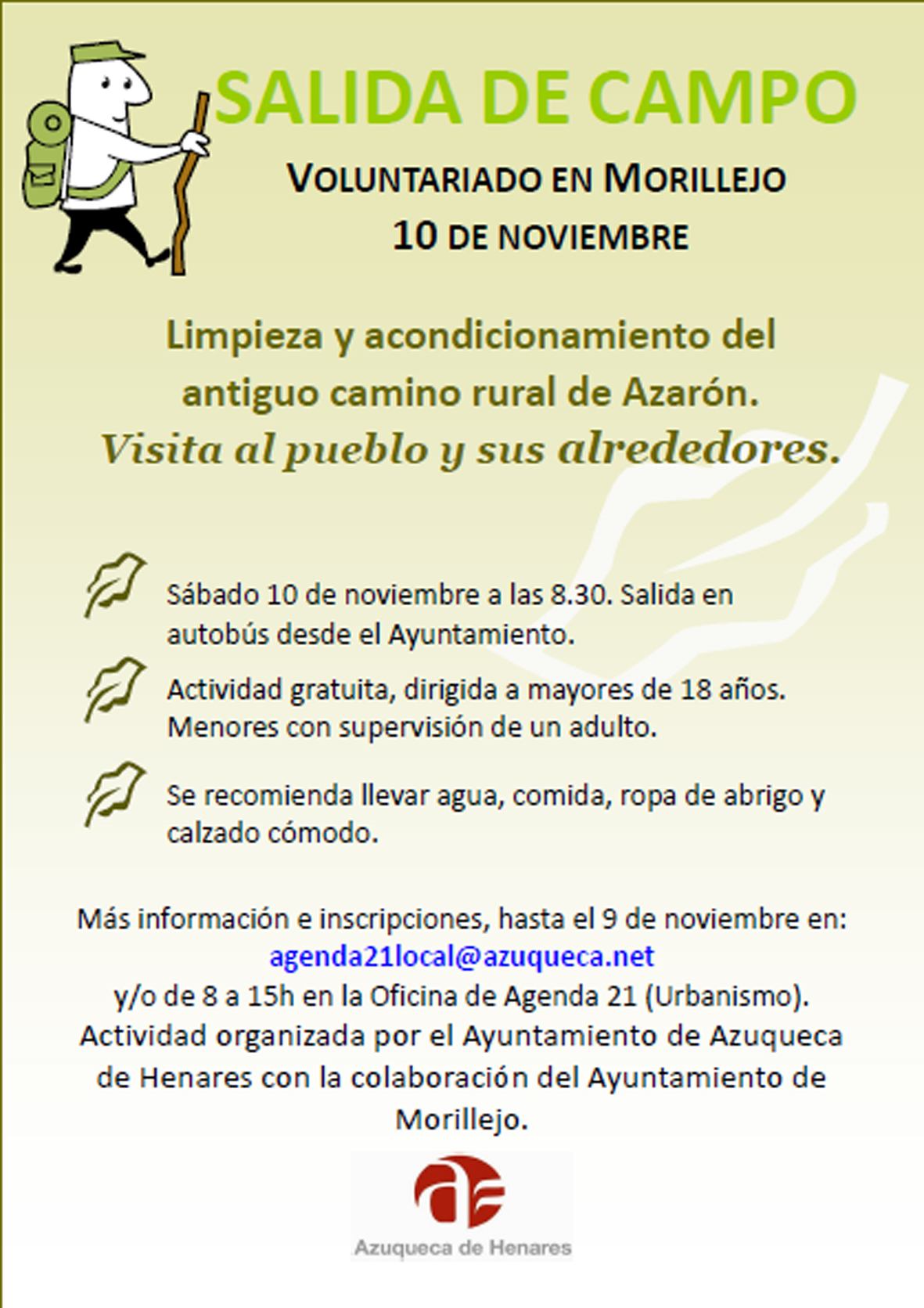 El Ayuntamiento de Azuqueca de Henares organiza el sábado 10 de noviembre una nueva Salida de Campo a Morillejo. "En esta ocasión, la actividad de voluntariado ambiental va a consistir en la limpieza y el acondicionamiento del antiguo camino rural de Azarón, que une las localidades de Morillejo y Arbeteta", avanza el concejal de Desarrollo Sostenible, Juan Pablo Román, quien aclara que "se dedicará la mañana a estos trabajos, mientras que por la tarde, se realizará una visita al pueblo y sus alrededores".La inscripción es gratuita y las personas interesadas deben escribir un correo electrónico a la dirección