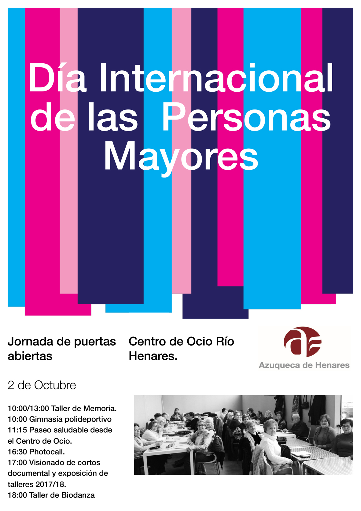 El Centro de Ocio Río Henares acoge una jornada de puertas abiertas el lunes 2 de octubre, coincidiendo con la celebración del Día Internacional de las Personas Mayores. "El programa incluye distintas actividades con las que se pretende dar difusión a la oferta lúdica y formativa con la que el Ayuntamiento de Azuqueca de Henares pretende dar respuesta a las necesidades e inquietudes de nuestros mayores", avanza la concejala de Promoción de los Mayores, Rufi Fernández.Las jornadas comenzarán a las 10 horas con una doble propuesta: el Taller de Memoria, que se imparte hasta las 13 horas en el Centro de Ocio, y una sesión de gimnasia en el polideportivo Ciudad de Azuqueca. "Además, a las 11:15 horas, se ha fijado la salida desde el Centro de Ocio para un nuevo Paseo Saludable, en el que las personas participantes recorren el municipio y realizan ejercicio en las zonas habilitadas con aparatos biosaludables", explica la edil. Ya por la tarde, a las 16:30 horas, se va a instalar un photocall en el Centro de Ocio, donde a las 17 horas se van a proyectar documentales en formato de cortometraje y se podrá visitar una exposición de los talleres del curso 2017/2018. Para finalizar, a las 18 horas, hay una clase del Taller de Biodanza.Rufi Fernández anima a las personas mayores de la ciudad a participar en estas jornadas de puertas abiertas. "Queremos que se acerquen a este espacio para que conozcan los recursos que tienen a su disposición", insiste.