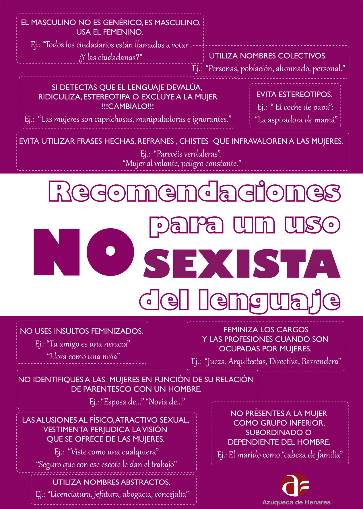 Con el objetivo de eliminar el uso sexista del lenguaje, el Pleno del Ayuntamiento de Azuqueca aprobó por unanimidad en febrero de 2015 un reglamento municipal que responde a uno de los ejes de actuación definidos en el I Plan de Igualdad Municipal aprobado en 2011 y que se ha venido aplicando hasta la actualidad. En el texto del reglamento, se hace referencia expresa a los elementos de imagen exterior como bandos, placas, logotipos, rótulos, señalización, documentos y publicidad. Y establece como ámbito de aplicación el Ayuntamiento, sus órganos de Gobierno y su plantilla, así como sus órganos autónomos y empresas municipales. Con el fin de ayudar a la difusión y aplicación de este reglamento, el Ayuntamiento editó una guía de la que disponen los diferentes departamentos municipales. La guía para la utilización de un lenguaje administrativo no sexista aborda los problemas del lenguaje reclacionados con el androcentrismo y el sexismo, recoge los errores más frecuentes, como los falsos genéricos o el orden de presentación, además de plantear estrategias y soluciones -términos genéricos, sustantivos colectivos o perífrasis, por ejemplo- y pone algunos casos prácticos.