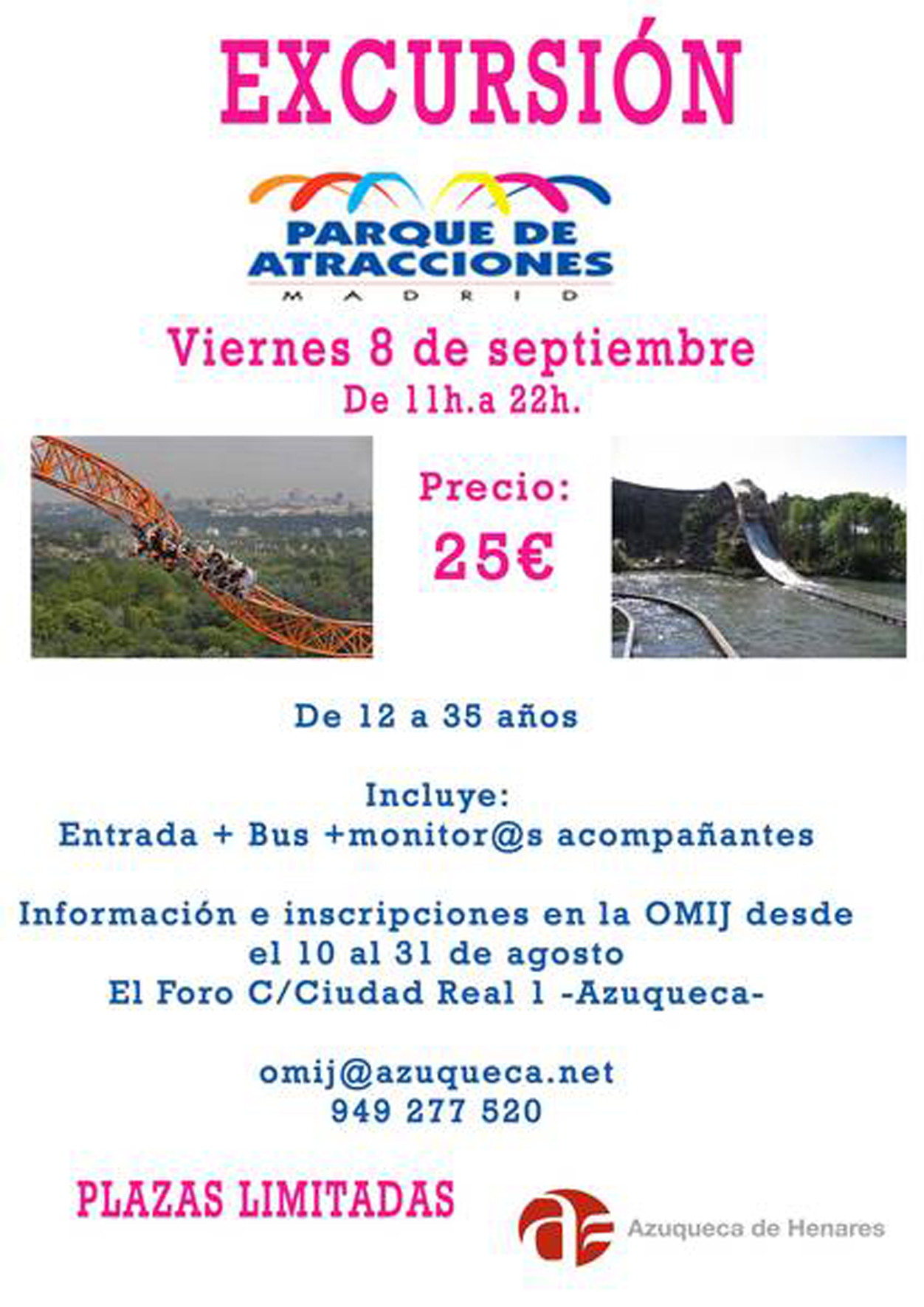 Hasta el 31 de agosto, permanece abierto el plazo de inscripción en la salida al Parque de Atracciones de Madrid que organiza el Ayuntamiento de Azuqueca de Henares. La actividad está prevista para el día 8 de septiembre, y está dirigida a jóvenes con edades comprendidas entre los 12 y los 35 años. El precio es de 25 euros, con la entrada al parque y el traslado en autobús.Todos aquellos que estén interesados en participar en esta salida podrán formalizar sus inscripciones en la Oficina Municipal de Información Juvenil (OMIJ), ubicada en El Foro, a través del correo electrónico omij@azuqueca.net, o en el teléfono 949 27 75 20."Esta salida se enmarca en el programa de Ocio Alternativo y Saludable que lleva desarrollando el Ayuntamiento de Azuqueca de Henares durante todo el verano", señala la concejala de Juventud, Carmen Luque, quien además explica que "es solo una más de todas las organizadas por este Ayuntamiento: Aquopolis, intercambios, el Verano Surfero o cursos de escalada deportiva han proporcionado a los jóvenes azudenses un verano cargado de actividades".