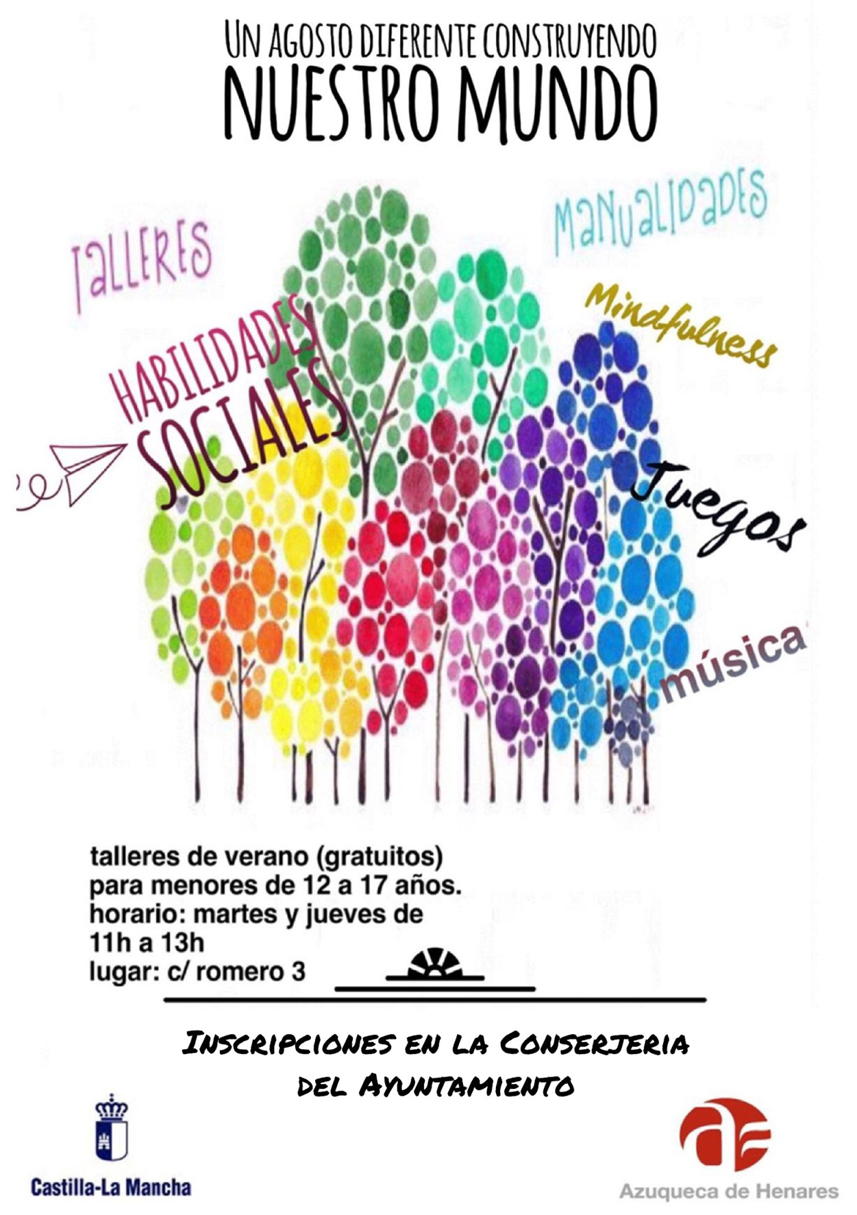 Este mes de agosto, el Ayuntamiento de Azuqueca de Henares ofrece unos talleres gratuitos para menores entre 12 y 17 años, dentro del programa denominado 'Un agosto diferente, construyendo nuestro mundo'. Las sesiones se celebran todos los martes y jueves del mes, de 11 a 13 horas, en el número 3 de la calle Romero, y las personas interesadas pueden inscribirse en la conserjería del Ayuntamiento.Contenido de los talleresEste programa, que cuenta con el apoyo de la Junta de Comunidades de Castilla-La Mancha, está compuesto por diversas actividades para jóvenes como manualidades, meditación, música, juegos o debates. "El objetivo es trabajar la inteligencia emocional con la población infantil y juvenil para ayudarles en su desarrollo como personas", señala la concejala de Educación y Cohesión Social, Elisa Cansado, quién además explica que "es importante que los más jóvenes aprendan a reconocer y a gestionar sus emociones". "Es fundamental trabajar aspectos como la ira, la tristeza, la autoaceptación o la amistad, y así ayudarles al desarrollo de sus habilidades sociales", concluye la concejala.Campaña de prevención del abuso de alcoholAdemás, el Ayuntamiento azudense ha puesto en marcha una iniciativa consistente en la prevención del consumo abusivo del alcohol. Este programa se está llevando a cabo dentro de la actividad municipal 'Viernes a la Luna' y en los lugares de reunión de la juventud durante los fines de semana, y se va a extender a las fiestas locales, con el objetivo de concienciar a la población azudense, y en especial a los más jóvenes.Para ello, dos educadoras de calle están informando sobre las consecuencias que este consumo de alcohol puede generar en los menores, y también se está trabajando en la prevención del consumo excesivo por parte de los adultos. También están repartiendo folletos que recogen los peligros que este consumo puede generar, así como piruletas con forma de corazón acompañadas de los lemas 'Saborea el lado dulce de la vida' o 'Que el alcohol no te amargue la vida'.Estas educadoras han sido contratadas a través del Plan Extraordinario por el Empleo puesto en marcha este año por el Ayuntamiento con apoyo del gobierno regional. "Forman parte del proyecto 'Atención a alumnos absentista y familias', que cuenta con un total de cuatro personas, todas ellas con formación superior, que se centran en tres aspectos: fomentar hábitos de vida saludable, mejorar de la convivencia y generar herramientas para las familias", detalla Elisa Cansado.