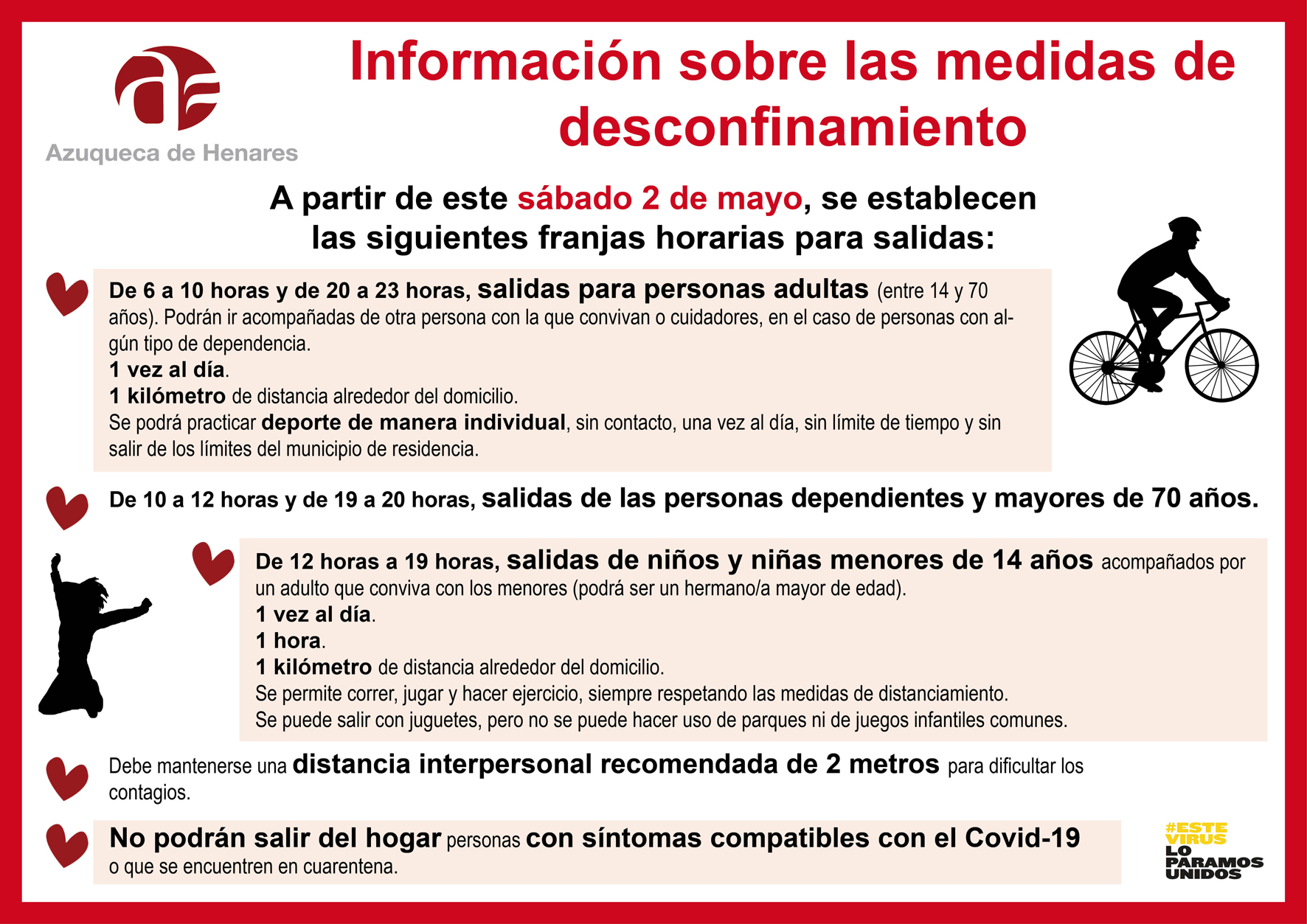 El Ayuntamiento de Azuqueca de Henares recuerda a la ciudadanía las condiciones establecidas por el gobierno Central de cara a la nueva medida de alivio del confinamiento, que permitirá desde este sábado, 2 de mayo, pasear y practicar deporte de manera individual a las personas adultas. Desde el Consistorio se hace hincapié en la "absoluta necesidad" de respetar las franjas horarias establecidas, a fin de prevenir un repunte de contagios por la COVID19. El Gobierno recuerda que, pese a que los datos de evolución de la enfermedad están mejorando, el virus no ha desaparecido, hay que convivir con él y, por ello, respetar las condiciones establecidas para evitar un repunte de contagios. Las autoridades reclaman responsabilidad individual y prudencia en esta nueva etapa.La orden de Sanidad que regula estas salidas establece las siguientes franjas horarias:- De 6 a 10 horas y de 20 a 23 horas, las personas adultas (entre 14 y 70 años) podrán dar paseos acompañados de otra persona con la que convivan (o cuidadores, en caso de personas con algún tipo de dependencia). Los paseos se deben limitar al radio de un kilómetro de distancia del domicilio, una vez al día.En la misma franja horaria, se podrá practicar deporte (sin límite de tiempo, ciñéndose a las horas establecidad) de manera individual, sin contacto, una vez al día y sin salir de los límites del municipio de residencia.- De 10 a 12 horas y de 19 a 20 horas, podrán salir a pasear las personas dependientes y los mayores de 70 años.- El paseo de menores de 14 años deberá ceñirse a partir del sábado a la franja comprendida entre las 12 y las 19 horas. Se mantiene la limitación de una salida diaria, de una hora de duración y en un radio máximo de un kilómetro desde el domicilio.Durante este nuevo periodo, el Ayuntamiento de Azuqueca de Henares mantendrá cerradas las áreas de juego infantiles y las pistas deportivas de la ciudad.De manera paralela, la autoridad sanitaria recuerda que se deben mantener las medidas de higiene básicas, con el lavado frecuente de manos y que se debe mantener una distancia interpersonal recomendada de 2 metros para dificultar los contagios.No podrán salir de casa personas que presenten síntomas compatibles con la COVID-19 o que estén en aislamiento o en cuarentena. Tampoco podrán salir los residentes en centros sociosanitarios de mayores.