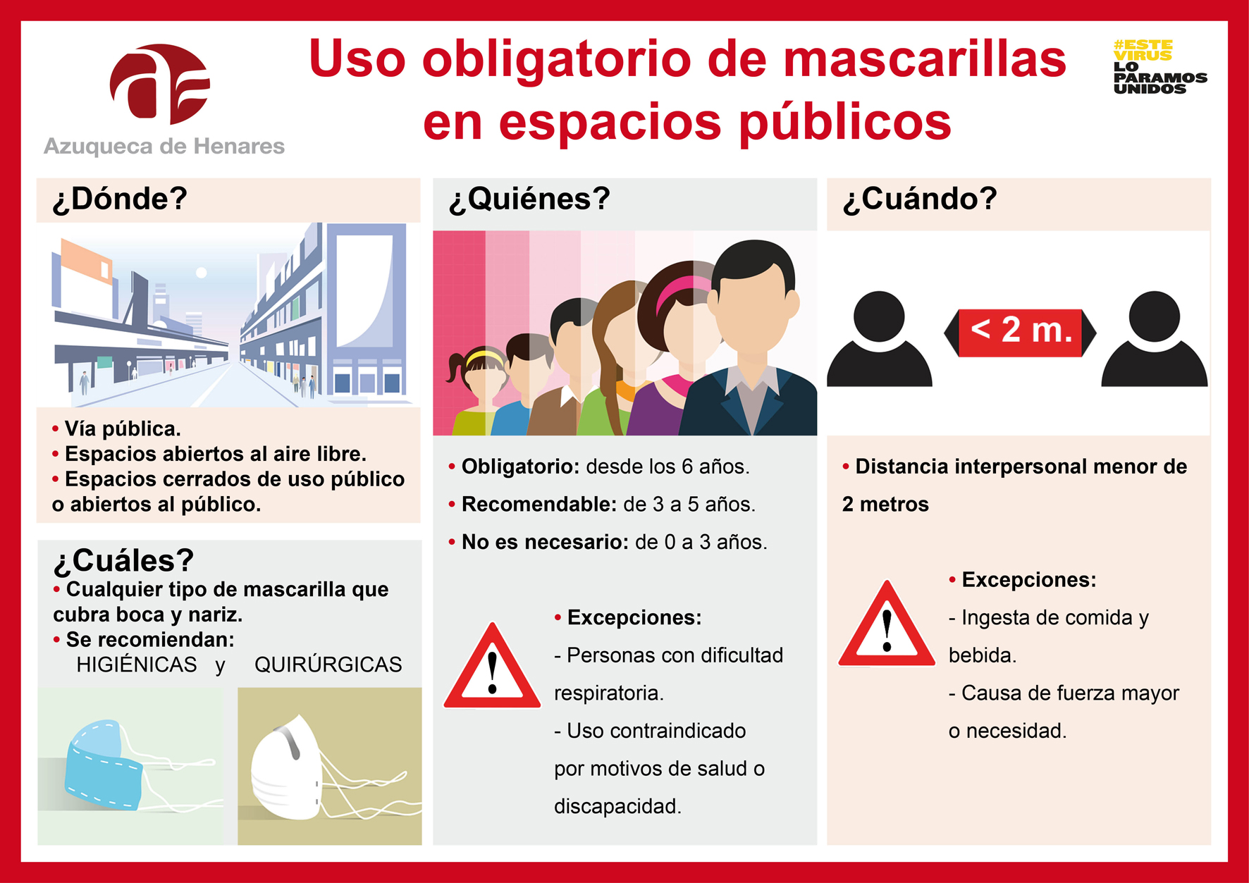 El Ayuntamiento de Azuqueca de Henares recuerda que desde este jueves, 21 de mayo, y como medida de prevención del contagio por la COVID-19 es obligatorio el uso de mascarillas en espacios públicos por parte de la población adulta y de niñas y niños mayores de seis años, con carácter general. Se recomienda además el uso de mascarilla para la población infantil de entre tres y cinco años.Las mascarillas deberán llevarse "en la vía pública, en espacios al aire libre y en cualquier espacio cerrado de uso público o que se encuentre abierto al público, siempre que no sea posible mantener una distancia de seguridad interpersonal de al menos dos metros", tal y como se establece en la orden publicada por el ministerio de Sanidad, publicada en el Boletín Oficial del Estado del miércoles 20 de mayo, que especifica que se podrá usar "cualquier tipo de mascarilla, preferentemente higiénicas y quirúrgicas, que cubra nariz y boca". La propia orden recoge los casos en los que no se exigirá el uso de mascarilla: "personas que presenten algún tipo de dificultad respiratoria que pueda verse agravada por la utilización de la mascarilla y a aquellas cuyo uso se encuentre contraindicado por motivos de salud o discapacidad". Asimismo, se prevé que no se exigirá su uso "en el desarrollo de actividades que resulten incompatibles, tales como la ingesta de alimentos y bebidas, así como en circunstancias en las que exista una causa de fuerza mayor o situación de necesidad".La obligatoriedad del uso generalizado de mascarillas se suma a las recomendaciones sanitarias para evitar contagios por la COVID-19, en concreto el mantenimiento de la distancia interpersonal (dos metros, como norma básica), la higiene de manos y el resto de medidas de prevención.