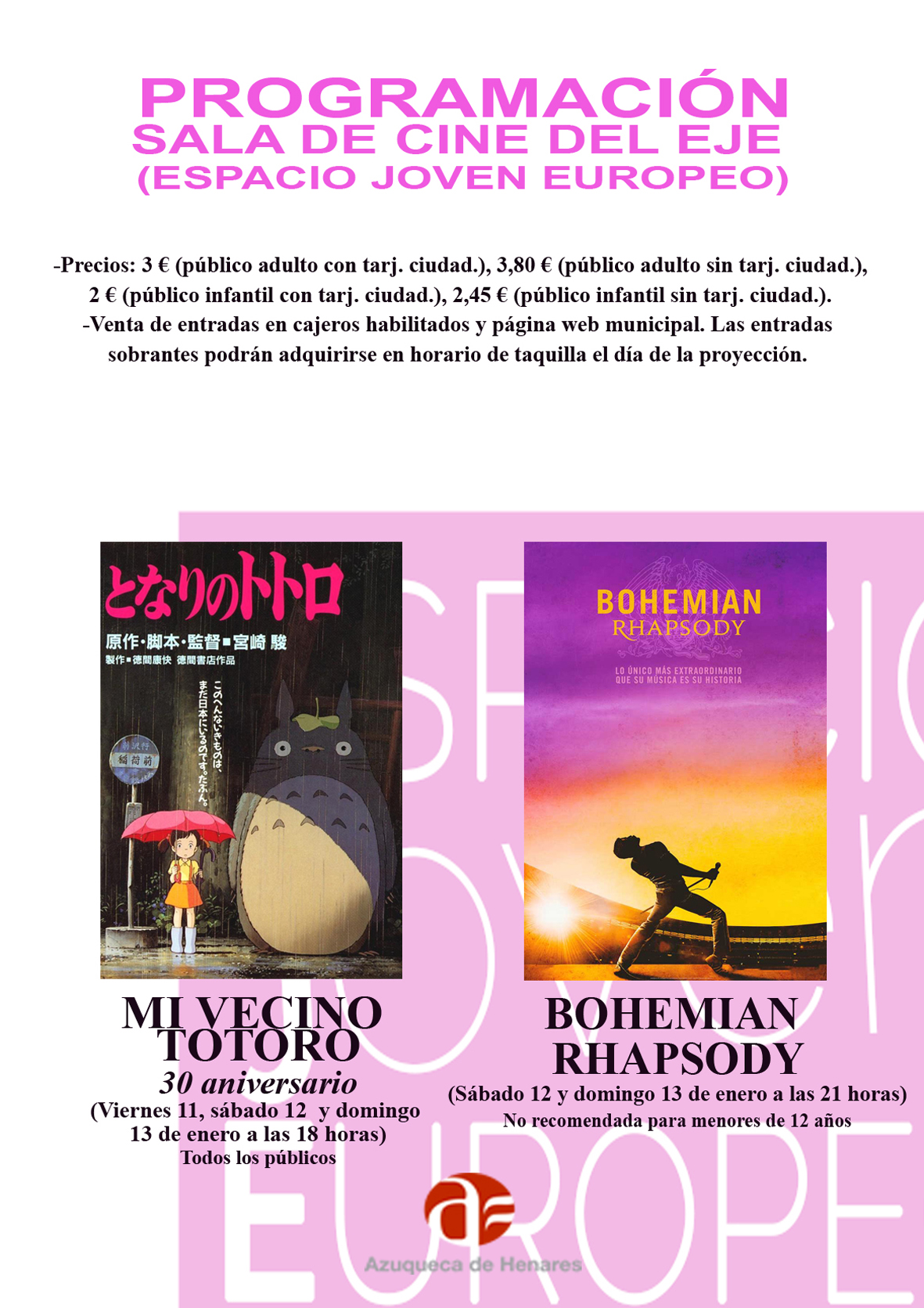 Este viernes, 11 de enero, comienza un nuevo ciclo de cine en versión original con subtítulos. Bajo el título 'Feel Good', se van a proyectar las películas 'Mamma Mía! Una y otra vez' (día 11), 'Bailando la vida' (día 18) y 'Con amor, Simón' (día 25). Todas las sesiones comienzan a las 20:30 horas en la sala del Espacio Joven Europeo (EJE).En cuanto a la cartelera comercial, este fin de semana se podrá ver 'Mi vecino Totoro' (viernes, sábado y domingo, 18 h.) y 'Bohemian Rhapsody' (sábado y domingo, 21 h., entradas agotadas).El precio es, con Tarjeta Ciudadana, 3 euros para el público adulto y 2 euros para el público infantil y, sin este documento municipal, de 3,80 y 2,45 euros, respectivamente. Las localidades se pueden adquirir en esta web municipal (pinche AQUÍ), cajertos ciudadanos y taquilla, hora y media antes del inicio de la sesión.Taller de cine Por otra parte, este jueves, 10 de enero, comienza el segundo trimestre del Taller Municipal de Cine que imparte el colectivo Bichobola (Susana García Cazalilla y José Antonio Orteu) cada jueves, de 19 a 21 horas, en la sala del EJE. 'La mujer en el cine' es la temática elegida para este curso y, en el segundo trimestre, se centrará en la maternidad y los estereotipos. La actividad, que se dirige a mayores de 18 años, está abierta a nuevas incorporaciones. El precio es de 30 euros al trimestre. Más información, en la conserjería de la Casa de la Cultura.Otras citasLa agenda del fin de semana incluye otras citas. Este viernes 11, a las 19 horas, el Aula de la UNED de Azuqueca organiza una mesa redonda sobre la explotación sexual en El Foro (más información, pinchando AQUÍ) y se entregan los premios de la Feria Taurina 2018 en el Centro de Ocio Río Henares. Además, el domingo 13, se celebra la primera plantación de la temporada del programa municipal 'En Azuqueca, nace un bebé, nace un árbol' con 150 moreras en la calle Ondas del polígono industrial Comendador, junto a la ITV (más información, pinchando AQUÍ).