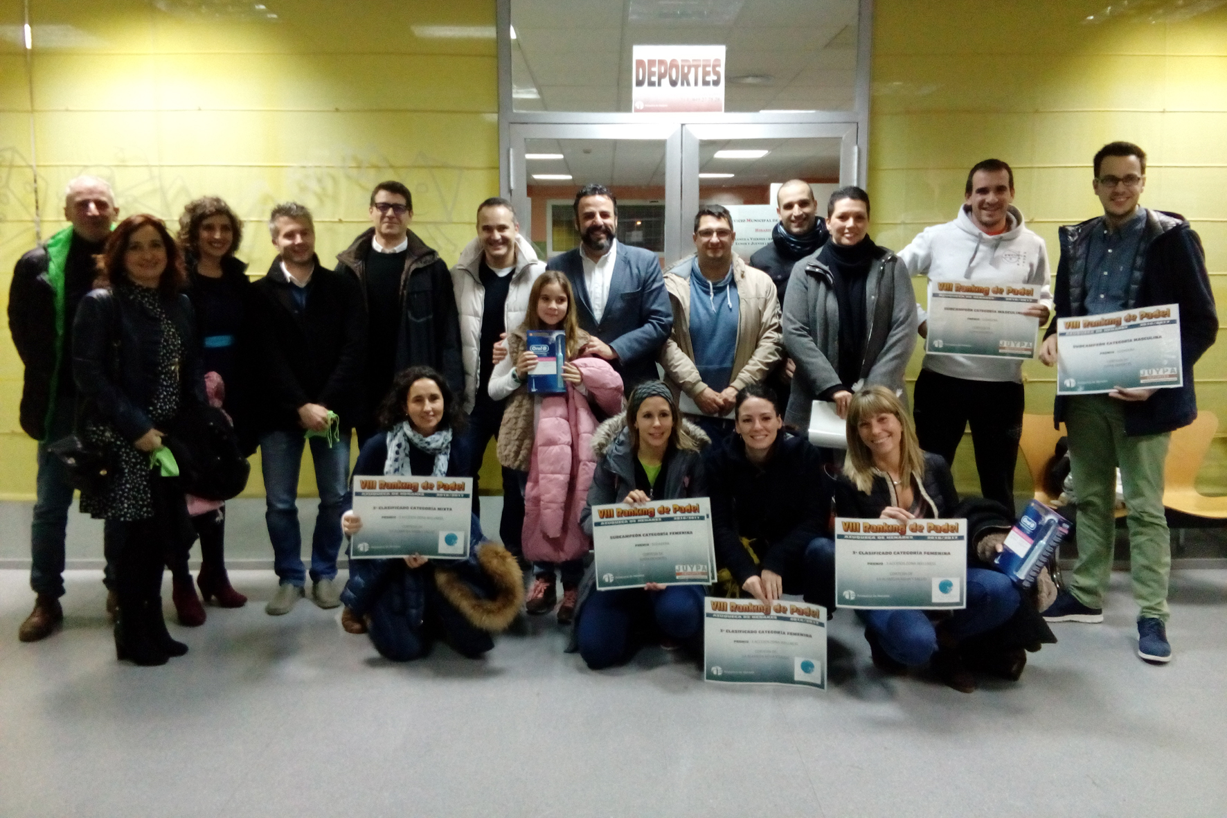 El alcalde, José Luis Blanco, y el concejal de Deportes, Sergio de Luz, han entregado los premios del VII Ranking de Pádel que organiza el Ayuntamiento de Azuqueca de Henares. "El ranking se puso en marcha hace ya ocho temporadas para dar respuesta a una demanda que planteaban los aficionados al pádel de nuestra ciudad", recuerda el concejal azudense, quien añade que "solicitaban la creación de una competeción en la que poder jugar con el aliciente de los puntos, la clasificación y los ascensos y descensos de grupo".El sistema de juego se divide en tres fases y cuenta con tres categorías: Masculina, Femenina y mixta. El curso pasado, más de 90 parejas disputaron cada una de las fases. Los partidos se celebran en las pistas municipales ubicadas en el complejo San Miguel y de la zona deportiva Arroyo del Vallejo.Premiados de la temporada 2016/2017CATEGORÍA MASCULINA