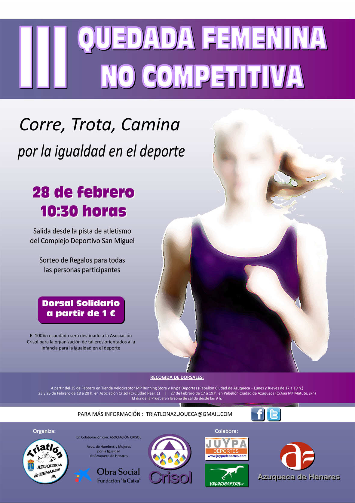 Más de 250 personas ya han retirado su dorsal para participar este domingo, 28 de febrero, en la tercera edición de la Quedada femenina no competitiva, que organiza el Club Triatlón Azuqueca de Henares con la colaboración de la asociación local Crisol y el Ayuntamiento. Esta propuesta, cuyo lema es 'Corre, Trota, Camina por la igualdad en el deporte', está abierta a la población en general, con independencia de su forma física, y la participación se mantiene abierta hasta el mismo día de la carrera.La Quedada es una de las actividades organizadas en Azuqueca con motivo del 8 de Marzo, Día Internacional de las Mujeres. Además, tiene un carácter solidario ya que la recaudación obtenida a través de los dorsales, que se pueden adquirir a partir de 1 euro, se destinará íntegramente a la asociación azudense Crisol para la organización de talleres infantiles que promuevan la igualdad en el deporte.Venta de dorsalesLos dorsales solidarios están disponibles en las tienda Velociraptor MP Running Store (Guadalajara) y en Juypa Deportes (pabellón Ciudad de Azuqueca, los lunes y jueves, de 17 a 19 h.). También se va a habilitar la venta el sábado 27 de febrero, de 17 a 19 horas, en el pabellón Ciudad de Azuqueca y el mismo domingo 28, día de la carrera, desde las 9 horas, en la pista de atletismo del complejo San Miguel.Circuito urbanoLa salida se ha fijado a las 10:30 horas desde la pista de atletismo del complejo San Miguel y se ha fijado un recorrido urbano con dos opciones: dos vueltas para quienes corran o troten y un vuelta para quienes se animen a caminar (pinche aquí para verlo). Todas las personas participantes van a recibir una bolsa del corredor y, además, entre todos los dorsales se van a sortear más de un centenar de regalos.