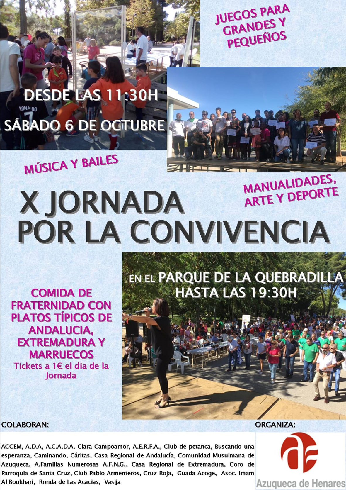 El Ayuntamiento de Azuqueca de Henares organiza este sábado, 6 de octubre, la décima edición de la Jornada por la Convivencia. "Se trata de una actividad abierta a todos los públicos con la que se pretende crear un espacio de conocimiento y enriquecimiento mutuo", explica la concejala de Cohesión Social, Elisa Cansado, quien recuerda que "en Azuqueca, todas las personas, con independencia de su ciudad o país de origen, suman y cuentan para lograr el objetivo de hacer cada día una ciudad mejor y con mayor bienestar para sus habitantes".La jornada se desarrolla en el parque de La Quebradilla entre las 11:30 horas y las 19:30 horas. Durante todo el día, se van a desarrollar actividades de sensibilización y se instalarán puntos de información de las entidades colaboradoras: Accem, ADA, ACADA Clara Campoamor, AERFA, Club de Petanca, Buscando una esperanza, Caminando, Cáritas, Casa Regional de Andalucía, comunidad musulmana de Azuqueca, AFNG, Casa Regional de Extremadura, coro de la parroquia de Santa CRuz, el club Pablo Armenteros, Crur Roja, Guada Acoge, la asociación Imam Al Boukhari, la ronda de Las Acacias y Vasija.Por la mañana, a partir de las 11:30horas, el programa contempla talleres de pintacaras tribal, títeres de dedo, decoración de la 'mochila por la convivencia', pintura, slime, marquetería y manualidades, además de una exhibición de karate, un campeonato de perejila, deporte adaptado y actuaciones de la ronda de Las Acacias y de la Casa Regional de Andalucía."A la hora de la comida, se podrán degustar al precio de 1 euro raciones de platos típicos de Andalucía y Extremadura con dulces y té de Marruecos -los tickets se podrán adquirir el mismo día-", avanza la edil azudense. La jornada continuará por la tarde hasta las 19:30 horas con la lectura de poemas a la figura de los abuelos y abuelas, nuevas sesiones de los talleres de expresión artística, manualidades, pintura y marquetería, con una exhibición de karate, el juego por la convivencia, minicampeonato de petanca, campeonato de la rana y música a cargo de asociación Imam Al Boukhari, el coro de la parroquia de Santa Cruz, el grupo La Jara de la Casa de Extremadura y Susa, profesora de ACADA, que ofrecerá una clase magistral de ritmo latino. "Para finalizar, se hará entrega de los diplomas de reconocimiento por el trabajo realizado a favor de una buena cohesión social en nuestro municipio", concluye la edil.