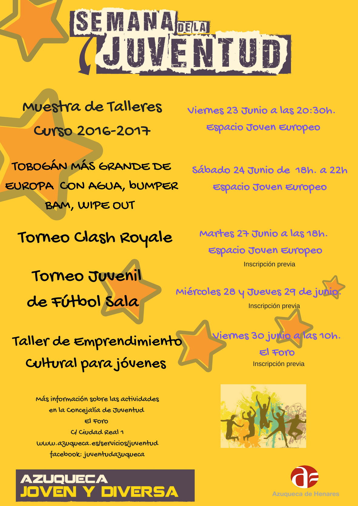 Bajo el lema 'Azuqueca, joven y diversa', el Ayuntamiento celebra la Semana de la Juventud con distintas actividades entre el 23 y el 30 de junio. "El programa se ha diseñado en colaboración con la población juvenil del municipio, que han aportado un gran número de ideas y sugerencias", explica la concejala del área, Carmen Luque, quien destaca que "son propuestas de todo tipo para dar cabida a la diversidad de intereses y gustos de los y las jóvenes azudenses".El programa arranca este viernes 23 con la Muestra de Talleres, que acoge la plaza del Espacio Joven Europeo (EJE) a partir de las 20:30 horas. "El alumnado de las clases municipales de Guitarra, Batería, Funky, Piano, Canto y Urban Dance participa en una exhibición con motivo del final del curso", detalla la edil de Juventud. El sábado 24 de junio, se ha programado 'Hello summer', una fiesta para cerrar el curso escolar y dar la bienvenida al verano con actividades de ocio saludable y alternativo en la plaza del EJE, de 18 a 22 horas. "Atendiendo las demandas de los jóvenes, se va a instalar distintos hinchables como el tobogán más grande de Europa con agua, surf y fútbol bola", explica Luque.Arte, Clash Royale, fútbol sala y emprendimientoLa Semana de la Juventud continúa el 26 de junio con la cuarta edición del Encuentro de Arte Urbano en el IES San Isidro y en el que también participan los institutos Arcipreste de Hita y Profesor Domínguez Ortiz. La actividad, que se incluye en el programa de Encuentros de Arte de Azuqueca, consiste en un taller de grafitis (de 10 a 14:30 h.), el juego 'Qué sabes del mundo' (de 11 a 12 h.) y slackline (de 12 a 13 h.).El 27 de junio, se juega el Torneo de Clash Royale (18 h., en el EJE) para mayores de 12 años. La inscripción, con un precio de 2 euros, se puede tramitar hasta este viernes 23 en la OMIJ.El miércoles 28 y jueves 29, se disputa el Torneo Juvenil de Fútbol Sala con dos categorías, Masculina y Femenina/Mixta, con dos grupos de edad: de 12 a 14 y de 15 a 17 años. La inscripción (4 euros por equipo) se cierra este jueves en la OMIJ. El programa finaliza el 30 de junio con un taller para jóvenes titulado 'Emprendimiento cultural, creación y desarrollo de proyectos' (10 h., en El Foro). Es una sesión gratuita para menores de 35 años en la que se explicará qué es el emprendimiento cultural, cómo realizar un proyecto cultural y creativo y cuáles son las capacidades necesarias y las necesidades formativas. Se requiere inscripción, que puede formalizar en la OMIJ.