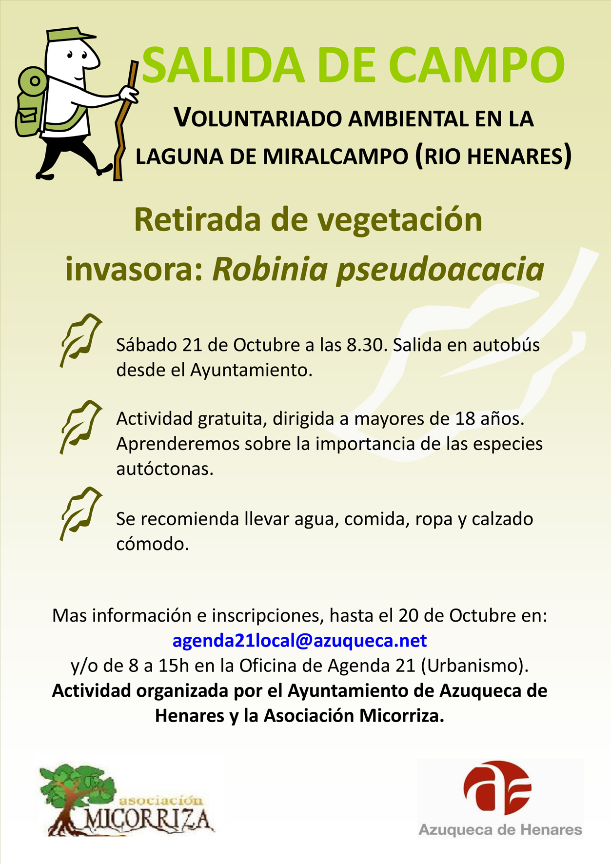 La Salida de Campo de otoño incluida en el programa de Voluntariado Ambiental del Ayuntamiento de Azuqueca se celebrará el sábado 21 de octubre y se desarrollará en la Laguna de Miralcampo. El concejal de Desarrollo Sostenible, Juan Pablo Román, explica que "la actividad se desarrollará en colaboración con Micorriza y que se ha previsto que los voluntarios retiren vegetación alóctona, introducida y que no es propia de la zona". Durante la jornada, también se tratará sobre la poblemática derivada de la presencia de especies invasoras.El plazo de inscripción en la salida ya está abierto a través del correo electrónico agenda21local@azuqueca.net. La participación es gratuita y el programa se dirige a mayores de edad.