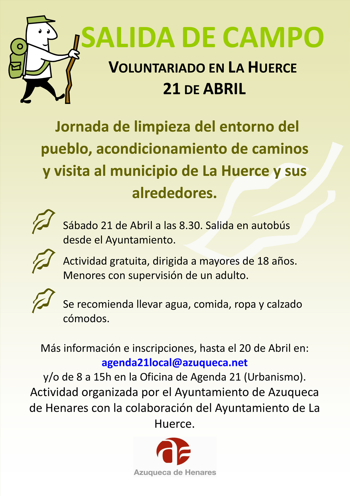 La tradicional Salida de Campo de primavera que organiza el Ayuntamiento de Azuqueca de Henares se celebrará finalmente el sábado 21 de abril. En un principio, se había programado esta actividad de voluntariado ambiental el 24 de marzo, pero fue aplazada ante la presencia de nieve en zona de La Huerce -municipio de destino- y las previsiones de lluvia y frío.La participación es gratuita y las personas interesadas se pueden inscribir a través del correo electrónico