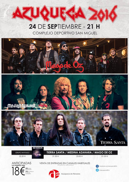 Continúan a la venta las entradas para el concierto organizado por el Ayuntamiento de Azuqueca el día 24 de septiembre con Mago de Öz, Medina Azahara y Tierra Santa como cabezas de cartel y la formación local Shock como grupo invitado. Las primeras 2.000 localidades que se adquieran en venta anticipada tendrán un precio especial de 18 euros en los cajeros ciudadanos. Una vez que se sobrepase esa cifra, el precio pasará a ser de 20 euros, y la tarifa para las localidades que se compren el mismo día del concierto en la taquilla del San Miguel se elevará hasta los 23 euros.