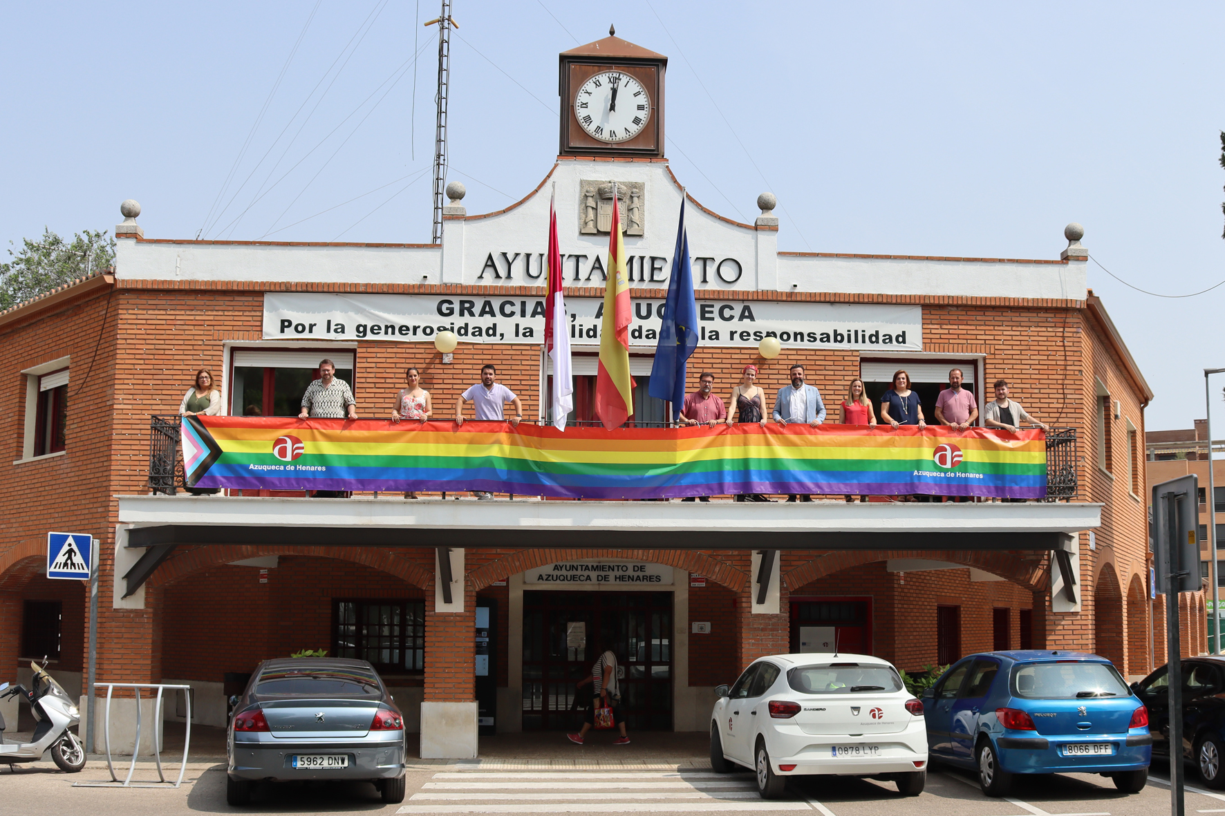 Coincidiendo con el Día Internacional del Orgullo LGTBI, este miércoles, 28 de junio, el Ayuntamiento de Azuqueca de Henares luce en su balcón principal la pancarta arcoíris, símbolo de este colectivo. El alcalde, José Luis Blanco, acompañado por la concejala de Igualdad de Oportunidades, Piedad Agudo; otros ediles del Equipo de Gobierno y del Partido Popular; Angel Castro, copresidenta de la asociación EACEC, y Alberto Martínez Centenera, socio de EACEC; han colocado la pancarta, que se mantendrá hasta el lunes 3 de julio.