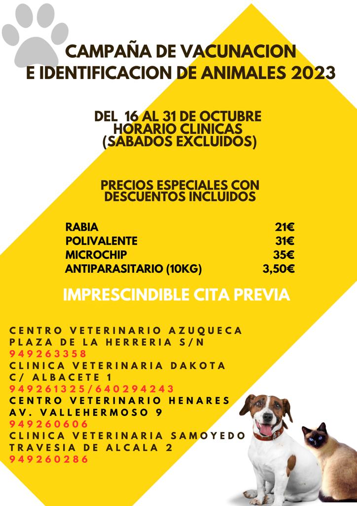 Entre los días 16 y 31 de octubre, se va a desarrollar la campaña anual de vacunación e identificación de animales domésticos que organizan las clínicas veterinarias de Azuqueca de Henares con la colaboración del Ayuntamiento. Los propietarios de mascotas deberán solicitar cita previa en cualquiera de los establecimientos, donde se inocularán las vacunas de la rabia y polivalente, se pondrán microchip identificativos y se podrán adquirir pastillas antiparasitarias.
