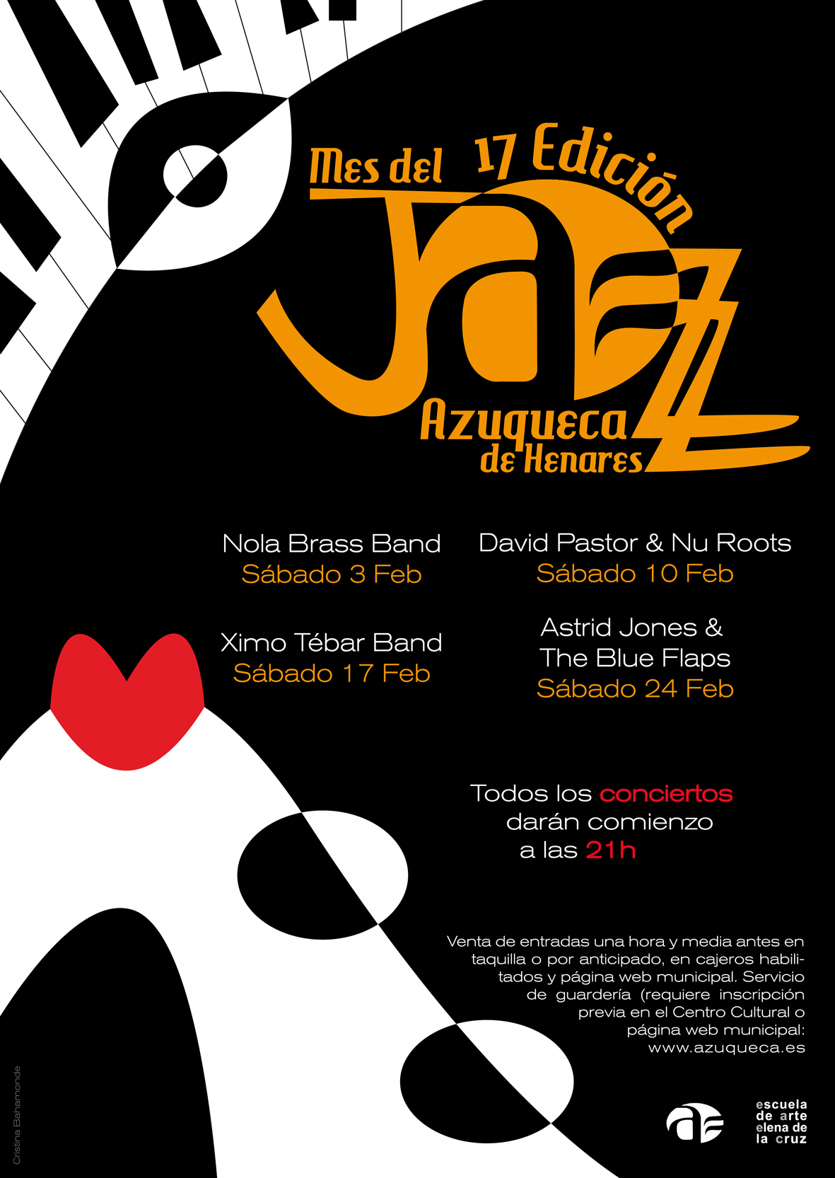 Actividades complementariasDel 2 al 26 de febrero, en la entrada de la Casa de la Cultura, se pueden visitar dos exposiciones. La primera recoge los trabajos presentados por el alumnado de la Escuela de Arte de Guadalajara Elena de la Cruz para la elección del cartel promocional del Mes del Jazz. "Desde hace seis años, contamos con la colaboración de esta Escuela para el diseño de la imagen que promociona este evento musical", recuerda la concejala de Cultura. "El alumnado ha presentado una veintena de propuestas y, entre la propia Escuela y el departamento municipal de Cultura, se ha elegido el cartel, obra de Cristina Bahamonde", explica. "El trabajo de estos estudiantes es magnífico y, para que el público pueda conocerlo, disfrutarlo y valorarlo, todos los diseños se exponen durante el mes de febrero en la Casa de la Cultura", aclara.