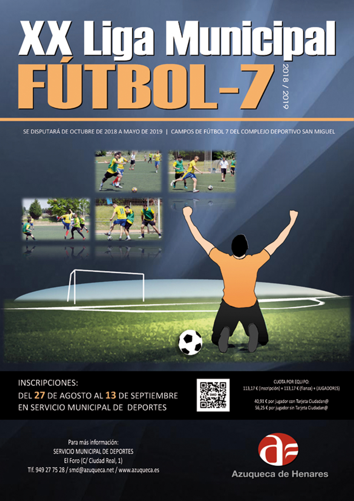 Este lunes, 27 de agosto, se ha abierto la inscripción en la Liga Municipal de Fútbol 7 de Azuqueca de Henares, que alcanza esta temporada su vigésima edición. Está previsto que la competición comience a disputarse a partir de octubre y que finalice en mayo de 2019. Como es habitual, los partidos se celebrarán en los campos del complejo San Miguel.