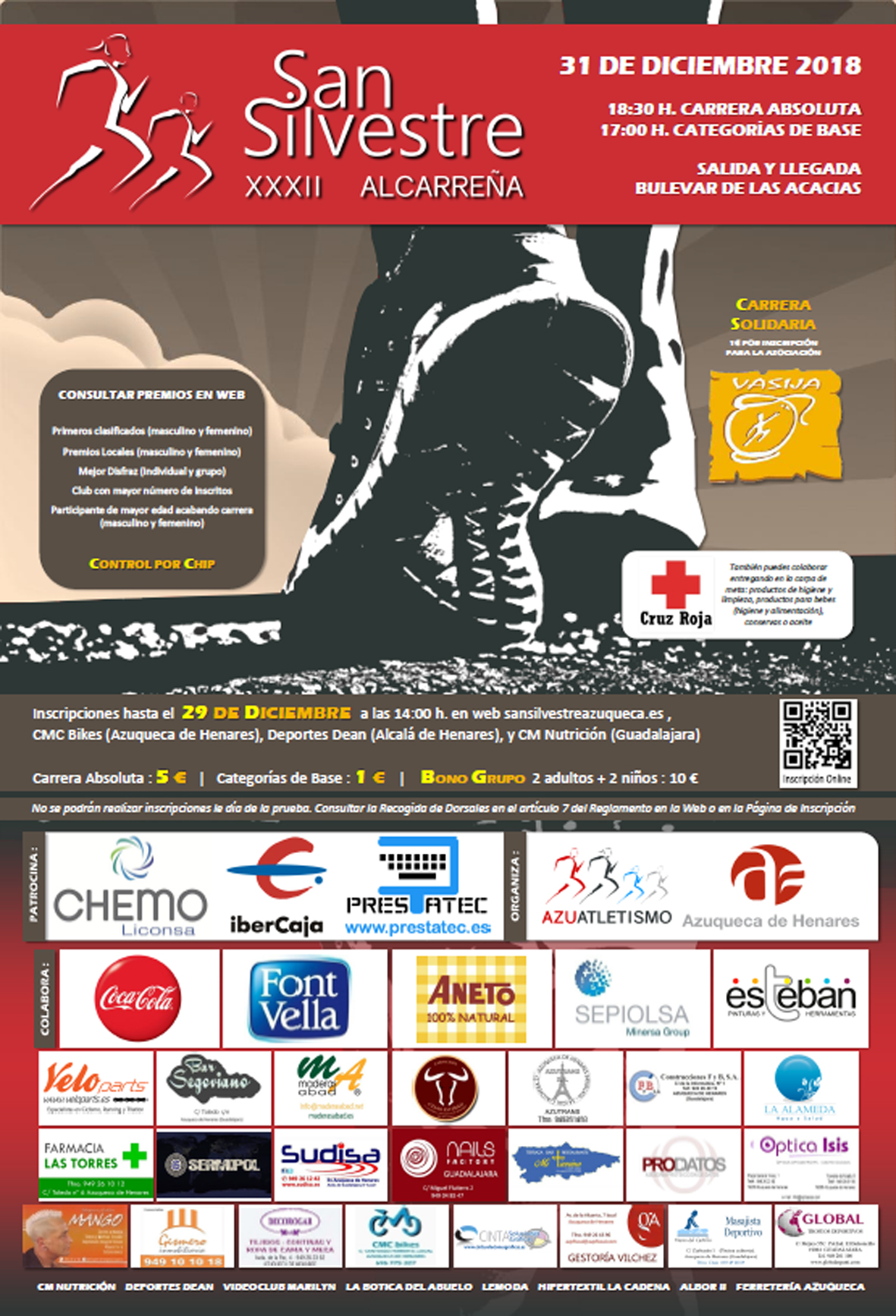 Este martes, 30 de octubre, se ha abierto el plazo de inscripción en la XXXII San Silvestre Alcarreña, que organizan el Ayuntamiento de Azuqueca de Henares y la asociación local Azuatletismo. "Esta prueba de atletismo, que se celebra el 31 de diciembre, es la más longeva de la provincia y una auténtica fiesta del deporte con corredores y corredoras de todas las edades, con categorías desde Chupetín a Absoluta", destaca el concejal de Deportes, Sergio de Luz, quien recuerda que este año se alcanzará la edición número 32.La participación se puede formalizar en la página web 'sansilvestreazuqueca.es', desarrollada por la empresa azudense 'Prestatec' y con toda la información de la prueba (pinche AQUÍ), o, de manera presencial, en los establecimientos 'CMC Bikes' (Azuqueca), 'Deportes Dean' (Alcalá) y 'CM Nutrición' (Guadalajara). El precio es de 5 euros para la categoría Absoluta (a partir de 15 años) y de 1 euro para las categorías base (de 0 a 14 años). Como novedad, en esta edición, está previsto que próximamente se lancen bonos de grupo para cuatro participantes -dos de Absoluta y dos de Base- con un precio de 10 euros. La inscripción se cerrará a las 14 horas del 29 de diciembre -hasta el día 26, se personalizarán los dorsales).Prueba solidaria"La San Silvestre Alcarreña mantiene su carácter solidario y se destinará un euro de cada inscripción a la asociación Vasija, que impulsa en la ciudad distintos programas dirigidos a menores y jóvenes en situación de vulnerabilidad o riesgo de exclusión social", explica el edil. "Ibercaja también se suma a la iniciativa y donará un euro por cada dorsal", añade el edil. "Además, se volverá a instalar un punto de recogida de alimentos no perecederos y productos de higiene para su posterior entrega a la sede local de Cruz Roja", apunta.Detalles de la carreraLa prueba discurre en un circuito a dos vueltas por el casco urbano, con salida y llegada en el Bulevar de Las Acacias a las 17 horas, para las categorías Base (distancias adaptadas) y a las 18:30 horas, para Absoluta, con una distancia de 7 kilómetros y con tiempos controlados mediante chip. En categorías Base, se entregan trofeos a los tres más rápidos (masculina y femenina), mientras que en Absoluta se establecen premios para los tres primeros clasificados en Absoluta y Absoluta locales (masculino y femenino), al mejor disfraz (individual y grupo), al club con mayor número de inscritos y, como novedad, al participante de mayor edad que acabe la carrera (masculino y femenino).