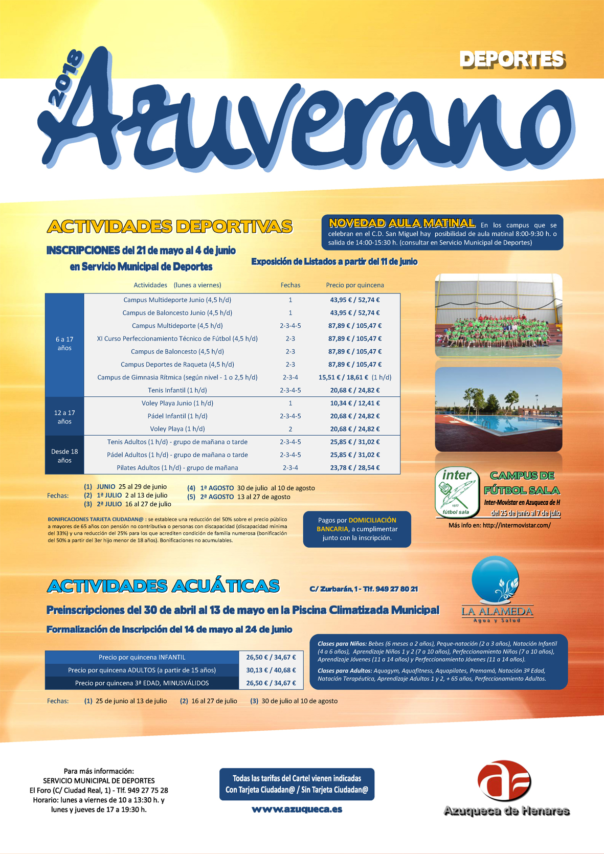 Desde este lunes, 21 de mayo, y hasta el 4 de junio, está abierto el plazo de preinscripción en el programa municipal Azuverano. "Un año más, el Ayuntamiento de Azuqueca de Henares lanza una oferta deportiva con una decena de actividades a partir de los 6 años", explica el concejal del área, Sergio de Luz, quien recuerda que los trámites deben formalizarse en la oficina del Servicio Municipal de Deportes (SMD), ubicada en el edificio El Foro (c/ Ciudad Real, 1. Tel: 949 27 75 28).