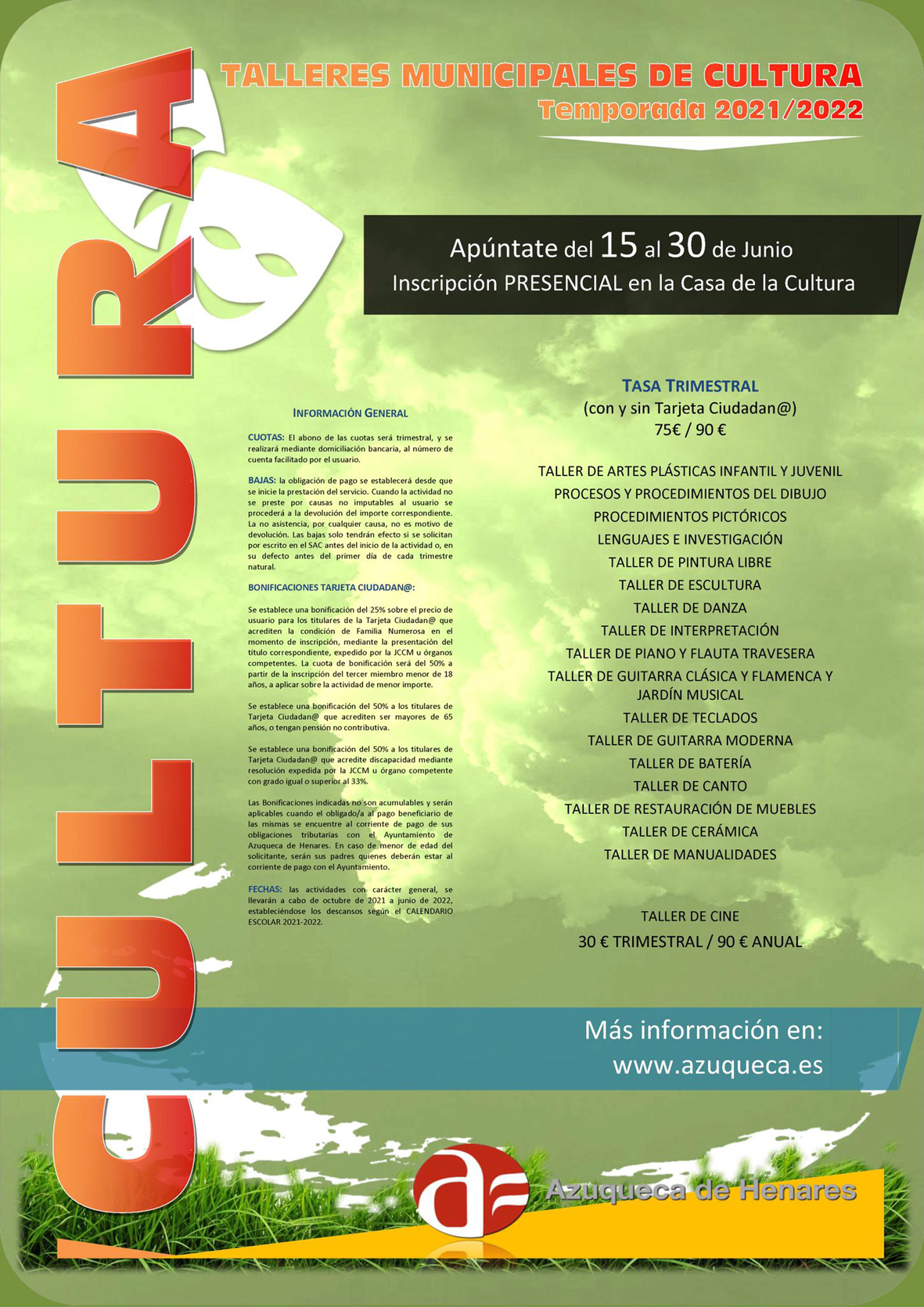Desde este martes, día 15, y hasta el próximo 30 de junio, se pueden formalizar las inscripciones en las actividades Culturales que organiza el Ayuntamiento de Azuqueca de Henares de cara a la temporada 2021/2022. Los trámites deberán hacerse de manera presencial, en la Casa de la Cultura.La programación municipal, que se desarrollará entre los meses de octubre de 2021 y junio de 2022, incluye talleres de artes plásticas infantil y juvenil, procesos y procedimientos del dibujo, procedimientos pictóricos, lenguales e investigación, taller de pintura libre, de escultura, de danza, de interpretación, de piano y flauta travesera, de guitarra clásica y famenca y jardín musical, de teclados, de guitarra moderna, de batería, de canto, de restauración de muebles, de cerámica y de manualidades. Ademas, se oferta un taller de cine.La tasa trimestral es de 75 euros para titulares de la Tarjeta Ciudadana y de 90 para quienes no dispongan de este título, salvo en el caso del taller de cine, para el que la tasa trimestral es del 30 euros y de 90 para la temporada completa. Se contemplan además bonificaciones para familias numerosas, mayores de 65 años o con pensión no contributiva y personas con discapacidad.
