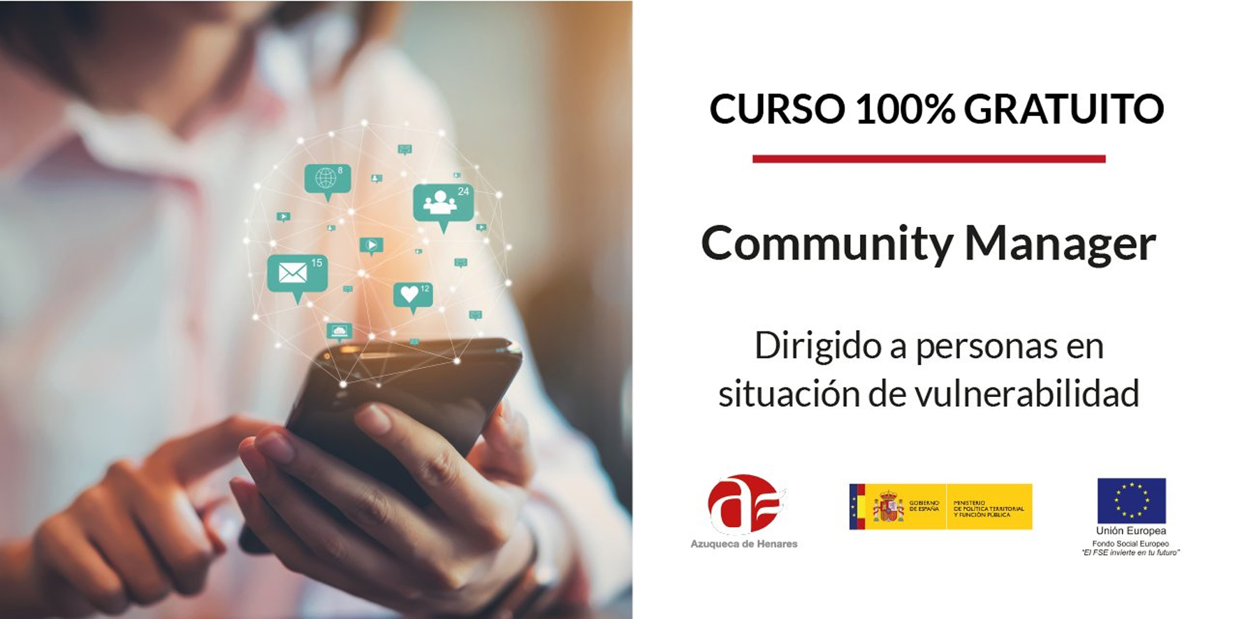 Desde este lunes día 19 y hasta el 30 de abril, el Ayuntamiento de Azuqueca de Henares mantiene abierto el plazo de solicitud del itinerario 'Community Manager' del Programa Operativo de Empleo, Formación y Educación (POEFE). Asimismo, se admiten inscripciones para cubrir las últimas vacantes en los cursos 'Atención sociosanitaria' y 'Cuidados de manos y pies'.El POEFE se dirige a personas desempleadas, inscritas como demandantes de empleo y que pertenezcan a colectivos vulnerables -desempleadas de larga duración, menores de 30 años, mayores de 55 años o con discapacidad, entre otros-. 'Community Manager' tiene una duración de 660 horas, mientras que 'Atención sociosanitaria' ofrece una formación de 480 horas y 'Cuidados de manos y pies', de 390 horas. Los tres itinerarios disponen de 15 plazas.La tramitación se debe realizar de manera preferible online (pinche AQUÍ). De manera presencial, las personas interesadas deben solicitar cita previa en el Servicio de Atención a la Ciudadanía a través de la web municipal (pinche AQUÍ) y en los números de teléfono 949 348 032 y 949 445 104 (operador virtual).Más información sobre el POEFE, pinchando AQUÍ, en el teléfono 608 627 782 y en el correo electrónico