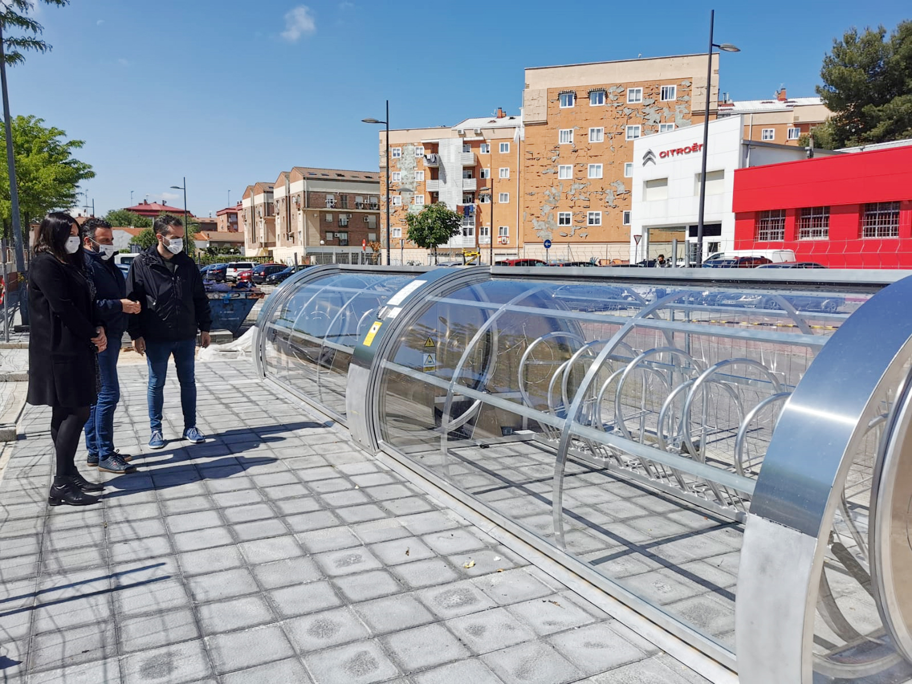Los trabajos para la instalación de un nuevo aparcabicicletas junto a la estación de tren de Azuqueca de Henares están en la fase final de su instalación y puesta en marcha. "Se trata de un modelo inteligente, con puerta, capacidad para 20 bicis y videovigilancia para una mayor seguridad; el primero de estas características de la región", detalla el concejal de Buen Gobierno, Álvaro Cuevas, recuerda que, además de esta unidad, ubicada en el paseo de la Estación, junto a la parada de autobuses, a la altura del edificio de acceso a Renfe, se están colocando otros nueve aparcabicis con capacidad para 12 bicicletas en los centros educativos de la ciudad. El edil, junto con el alcalde, José Luis Blanco, y la concejala de Innovación Urbana, Yolanda Rodríguez, ha visitado la zona este martes, 4 de mayo."Esta actuación forma parte del proyecto 'Caminos escolares seguros', que impulsa el Ayuntamiento con el objetivo de conseguir una movilidad urbana más sostenible y, para ello, se persigue fomentar el uso de la bicicleta en los trayectos a colegios e institutos, junto con otros puntos de interés en la ciudad, y, de este modo, disminuir el uso del vehículo privado", explica el edil.UtilizaciónPara poder utilizar el aparcabicis inteligente, es necesario descargar de manera gratuita en el móvil la aplicación denominada 'PVerde' y registrarse. Para ello, es necesario introducir el número de teléfono, donde se envía un SMS con un código de verificación, y un correo electrónico. Posteriormente, se solicitan los datos personales y de la bicicleta. Una vez dentro de la App, hay que pulsar el botón 'Bicicleta' y seleccionar la opción 'Bicis Azuqueca de Henares'. Para guardar una bicicleta, hay que abrir la puerta mediante la App o con un código personal y se cierra pulsando el correspondiente botón. Para recuperar la bicicleta, hay que abrir la puerta con la App o con el código personal.'Caminos escolares seguros', que ejecuta la empresa Eulen, SA por un importe de 227.967,83 euros, IVA incluido, se incluye en la línea 3 de la Estrategia de Desarrollo Urbano Sostenible Integrada (EDUSI). Cuenta con financiación del Fondo Europeo de Desarrollo Regional (FEDER), que aporta el 80 por ciento del total, mientras que el Ayuntamiento de Azuqueca sufraga el 20 por ciento restante.Entre las acciones recogidas en el proyecto, destaca la instalación de once desfibriladores -semiautomáticos, con pantalla táctil a color y conexión 24 horas mediante wifi- en todos los colegios e institutos, así como en el Ayuntamiento. Un cartel informativo central en la plaza de La Constitución, hitos informativos, señalización horizontal y vertical, 10 fuentes, 200 metros de vallado y los mencionados 10 aparcabicis completan las acciones previstas.