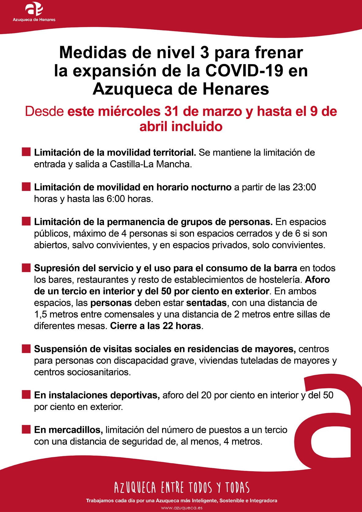 La Delegación Provincial de Sanidad en Guadalajara ha decretado este miércoles, 31 de marzo, medidas de nivel 3 para Azuqueca de Henares ante el incremento en el número de contagios por COVID-19. Según los datos recopilados por la Sección de Epidemiología del Servicio de Salud Pública, en la semana 12 del año (del 22 al 28 de marzo), en Azuqueca, con 35.407 habitantes, se han registrado 89 casos y la tasa de incidencia se sitúa en 251,4 casos por cada 100.000 habitantes -los criterios sanitarios de Castilla-La Mancha para las medidas de nivel 3 se sitúan en 10 o más casos y una tasa de incidencia igual o superior a 250 casos-.En cuanto a las medidas, con una vigencia de 10 días, hasta el 9 de abril incluido, se aplican además las limitaciones establecidas con motivo de la Semana Santa por la Junta de Comunidades de Castilla-La Mancha: limitación de la movilidad territorial (no se puede salir de la región, aunque sí se puede viajar entre provincias), limitación de movilidad en horario nocturno (toque de queda entre las 23 y las 6 horas) y limitación de permanencia de grupos de personas (en espacios públicos, máximo de 4 si son cerrados y máximo de 6 si son abiertos, salvo en caso de convivientes, mientras que en espacios privados, las reuniones se limitan a convivientes).A continuación, se detallan las medidas de nivel 3 de aplicación en Azuqueca de Henares:Locales de ocio- Cierre de hogares de jubilados y centros colectivos de sociedades recreativas y culturales.- Supresión del servicio y el uso para el consumo de la barra en todos los bares, restaurantes y resto de establecimientos de hostelería. El aforo en locales cerrados dedicados a esta actividad se reducirá a un tercio del máximo que tuvieran establecido previamente con distancia de al menos 2 metros entre las sillas de diferentes mesas, manteniendo en todo momento el resto de medidas establecidas en la normativa en cuanto a distancias de seguridad y agrupación. Queda expresamente prohibido añadir elementos móviles o fijos anejos a la barra que puedan ampliar la superficie de esta y permitir su uso como mesa.- Los espacios al aire libre de bares y restaurantes reducirán su aforo al 50 por ciento del número máximo de mesas que tuvieran establecido previamente con distancia de al menos 2 metros entre las sillas de diferentes mesas, manteniendo en todo momento el resto de medidas establecidas en la normativa en cuanto a distancias de seguridad y agrupación. Se entiende por espacio al aire libre todo espacio no cubierto o todo espacio que estando cubierto esté rodeado lateralmente por un máximo de dos paredes, muros o paramentos.- Cierre al público de bares, pubs, cafeterías, establecimientos de restauración y similares una hora antes del inicio del horario de restricción de movilidad nocturna establecido en ese momento.- Para garantizar el control de aforo y el mantenimiento de las medidas de seguridad, en establecimientos de hostelería queda prohibido el servicio a las personas usuarias que no se encuentren sentadas en las mesas dispuestas a tal efecto, tanto en espacios al aire libre como cerrados, así como el consumo de comidas y bebidas fuera de estas.- Las celebraciones posteriores a eventos como bodas, comuniones, bautizos y otros de similares características en locales de hostelería y restauración tendrán limitado su aforo a 30 personas en espacio abierto, siempre adecuándose a las condiciones de porcentaje de aforo máximo permitido. Si estas celebraciones posteriores se llevan a cabo en otro tipo de instalaciones, no se podrá superar el número máximo de 6 personas. Se deberá garantizar el resto de las medidas recogidas en la regulación en vigor siempre garantizando el resto de las medidas recogidas en la regulación en vigor.- Cierre de locales de juego y apuestas, bingos y establecimientos similares.Centros Socio-Sanitarios- Suspensión cautelar de la actividad en los Centros de Día de personas mayores y personas con discapacidad y de servicios de estancias diurnas de personas mayores.