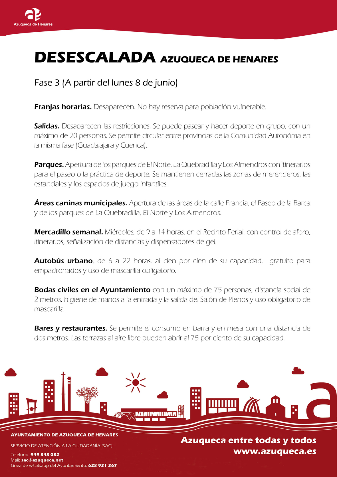 Azuqueca de Henares, al igual que el resto de la provincia de Guadalajara, se encuentra desde este lunes, 8 de junio, en la Fase 3 del Plan de Desescalada diseñado por el Gobierno de España con el objetivo de conseguir la adaptación de la sociedad a la denominada 'nueva normalidad' después de la crisis provocada por la COVID-19. Entre las novedades del cambio de fase, el Ayuntamiento azudense retoma la celebración de bodas civiles en el Salón de Plenos.En cumplimiento de las medidas de seguridad incluidas en la correspondiente orden, el aforo máximo permitido es de 75 personas, se debe guardar una distancia social de 2 metros entre invitados -los contrayentes podrán estar sin cumplir este distanciamiento-, habrá que cumplir con la higiene de manos a la entrada y salida del Salón de Plenos y el uso de mascarilla es obligatorio para todos los asistentes, incluidos los contrayentes.Las personas interesadas pueden informarse en el Servicio de Atención a la Ciudadanía (SAC) del Ayuntamiento a través de los números de teléfono 010, si se llama desde Azuqueca, y 949 348 032, si se marca desde fuera del municipio, y del correo electrónico AQUÍ.