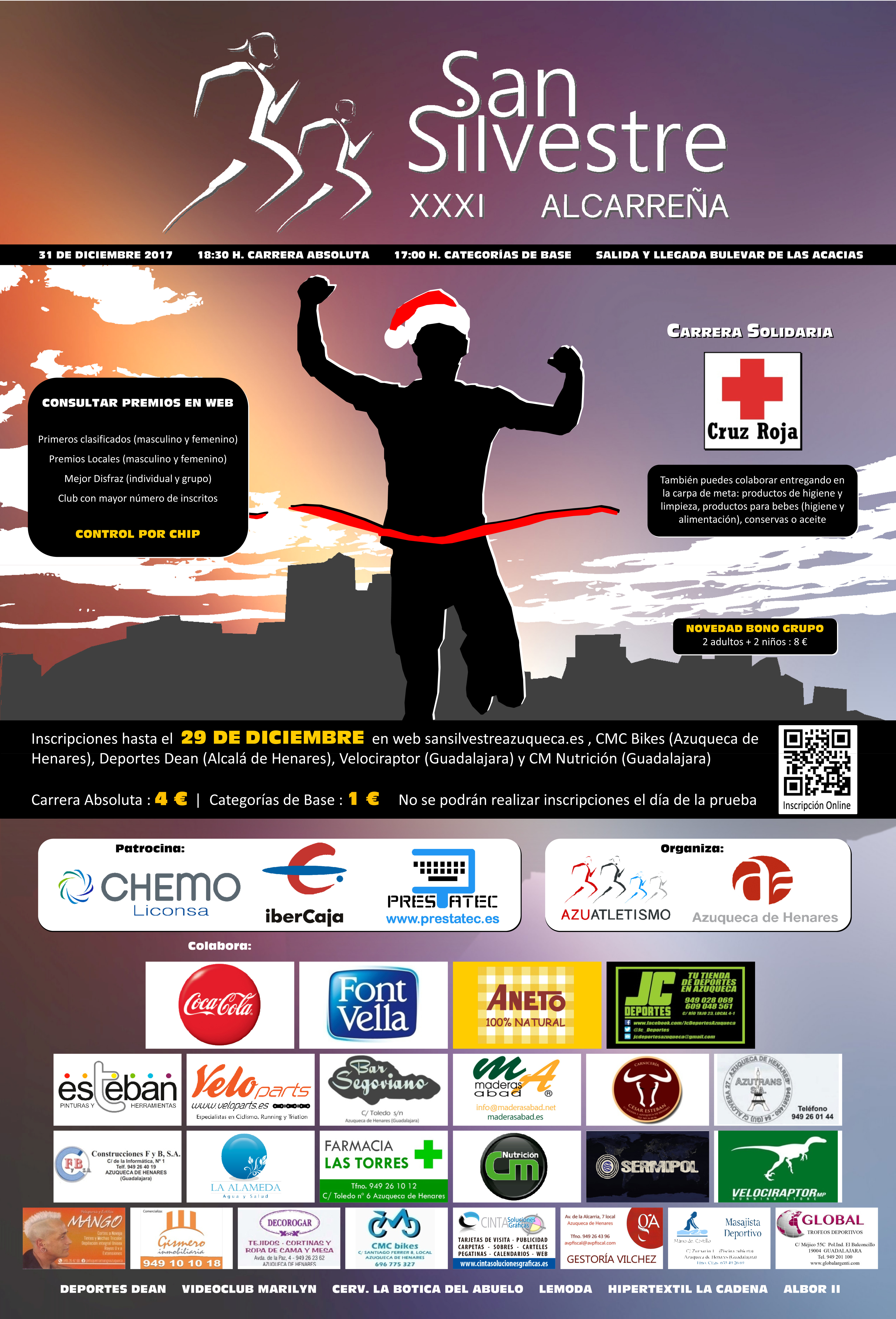 PremiosEn Absoluta, los tiempos se controlarán mediante chip desechable de última tecnología adherido directamente al dorsal. Habrá premios para los ganadores y trofeos para los tres primeros de cada categoría. También se reconocerá a los tres mejores disfraces (individual y en grupo), para el club con más corredores inscritos que completen la prueba y para los tres primeros clasificados locales (masculino y femenino). Los premios son acumulables.Chemo Group, Ibercaja y Prestatec, empresa instalada en el centro Azuqueca Emprende y que desarrolla la página web de la San Silvestre Alcarreña, entre otros colaboradores, patrocinan este año la XXXI edición de la carrera.