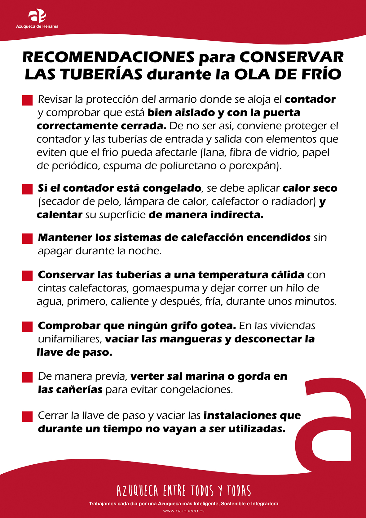 Ante las bajas temperaturas que se están alcanzando en Azuqueca de Henares por las noches, el Ayuntamiento está difundiendo una serie de recomendaciones para evitar la congelación de las tuberías y sobre cómo actuar en caso de congelación. La Agencia Estatal de Meteorología (AEMET) mantiene la alerta roja en Azuqueca y en toda la zona de la Alcarria de Guadalajara por temperaturas mínimas para este martes, 12 de enero, cuando la previsión es de -8 grados, y la alerta amarilla para el miércoles 13 (-6) y jueves 14 (-5) de enero.Con temperaturas bajo cero, es posible que las conducciones de agua o sus elementos de medida queden congelados, lo que provoca la interrupción del suministro a las viviendas. Para evitar estos problemas, es importante revisar la protección del armario donde se aloja el contador y comprobar que se encuentra bien aislado y con la puerta correctamente cerrada. En caso de no ser así, conviene protegerlo con elementos que eviten que el frio pueda afectarle, como son, por ejemplo, tejidos de lana, fibra de vidrio, papel de periódico en gran cantidad, espuma de poliuretano o porexpán. Esa protección debe cubrir la totalidad del contador, así como las tuberías de entrada y salida.Si el contador se encuentre congelado, se debe aplicar calor seco y calentar su superficie de manera indirecta hasta que se consiga la descongelación y el correcto paso del agua. Puede usarse un secador de pelo, una lámpara de calor, un calefactor o un radiador, pero nunca durante mucho tiempo. No debe forzarse la llave de paso.Asimismo, es conveniente mantener los sistemas centrales de calefacción encendidos, sin apagarlos durante la noche y en régimen reducido o de mantenimiento.Para conservar las tuberías a una temperatura cálida, se recomienda envolverlas con cintas calefactoras, aplicar gomaespuma y dejar correr un hilo de agua, primero, caliente y después, fría, durante unos minutos.Es importante comprobar que ningún grifo de la casa gotea para evitar que ese agua pase a las tuberías y se convierta en hielo.En las viviendas unifamiliares con mangueras o grifos exteriores, hay que vaciar las mangueras para evitar que el agua de su interior se congele y haga que las tuberías revienten. También se puede desconectar la llave de paso.De manera previa al desplome de las temperaturas, se puede verter sal marina o gorda en las cañerías para prevenir posibles congelaciones.En las instalaciones que durante un tiempo no vayan a ser utilizadas, hay que cerrar la llave de paso y vaciar el interior.