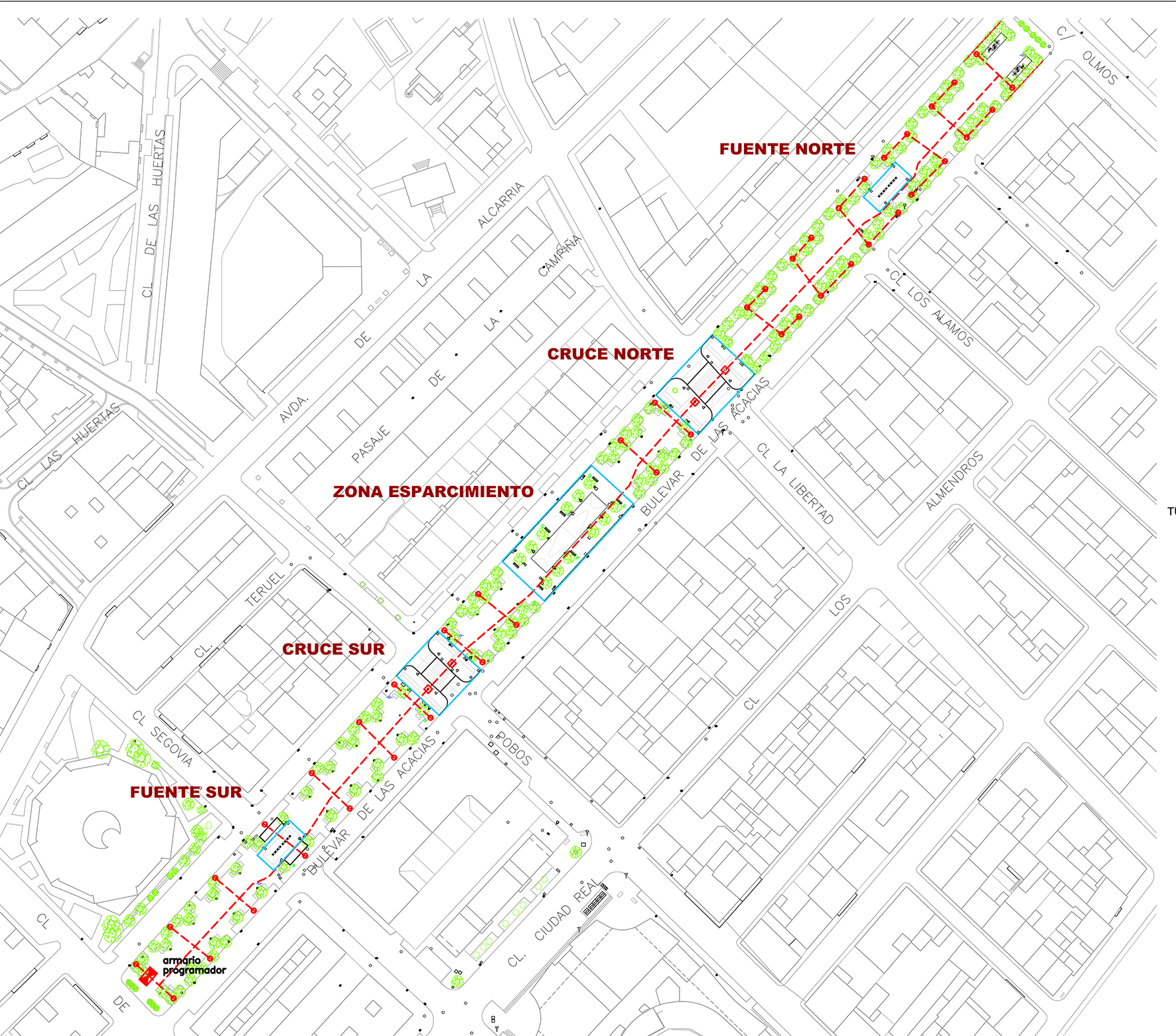 de reunión y esparcimiento, y disfrutará de un incremento de espacios verdes", según se recoge en el proyecto. "En concreto -detalla Expósito-, el espacio ocupado ahora por la fuente ornamental, en el tramo central del bulevar, se convertirá en un lugar de reunión y esparcimiento. El tramo central tendrá un murete y contará con vallado en el encuentro con los viales para incrementar la seguridad de los peatones". "Se pondrán dos fuentes transitables, una a la altura de la calle Segovia y otra entre las calles Los Álamos y los Abetos, que aportarán humedad al ambiente y contribuirán a rebajar la temperatura en los meses de más calor. Cuando no estén en funcionamiento estas fuentes -con un consumo mínimo porque reutilizan y reciclan el agua-, se podrá transitar por la zona", añade el edil. También se prevén mejoras en los pasos de peatones para dar preferencia y seguridad a las personas frente a los vehículos. Asimismo, se prevén mejoras en la eficiencia del riego para reducir el consumo de agua.Se sustituirá el pavimento por material ecológico y sostenible, con el fin de disminuir los costes de renovación a futuro y el impacto negativo en el medio ambiente -pavimento descontaminante de última tecnología, que permitiría la eliminación de contaminantes de la atmosfera- y se utilizarán luces de tipo LED en los elementos de señalización, alimentados con energía solar fotovoltaica, con lo que se logra una mejora de eficiencia energética.Juegos infantilesEl proyecto contempla "como elemento destacado la instalación de una singular área de juegos infantil, con una superficie de 155 metros cuadrados", señala el responsable municipal de Ciudad Sostenible. "Se trata de un diseño vanguardista que se acompañará de suelo de seguridad. Compuesto por dos estructuras con varios módulos y varias plataformas, el modelo permitirá ver a las niñas y niños desde cualquier punto", describe Expósito. En su interior habrá varios elementos de juego: paneles de juego (ábaco, laberinto, caminos), anillas, escalera de trepa, barra de bomberos y toboganes.