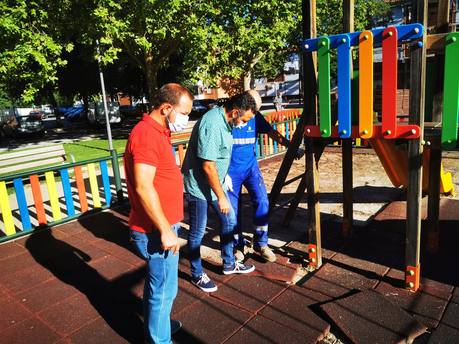 Operarios del Ayuntamiento de Azuqueca de Henares, con el apoyo de trabajadores contratados a través del Plan de Empleo, están llevando a cabo trabajos de mantenimiento y mejora en varios parques infantiles de la ciudad. El concejal de Ciudad Sostenible, Antonio Expósito, que ha visitado con el alcalde, José Luis Blanco, algunas de estas zonas, ha explicado que "se han previsto distintas intervenciones, en función de las necesidades detectadas en las áreas de juego destinadas a las y los niños".En concreto, en el parque infantil de la plaza José Luis, se ha sustituido la arena por suelo de goma, en una superficie de alrededor de 70 metros cuadrados, y los elementos de juego infantiles se han pintado para protegerlos de la climatología. Por otro lado, en la Plaza de Los Girasoles se está sustituyendo el suelo de goma, que estaba muy deteriorado, por uno nuevo. En este caso, la superficie ronda los 200 metros cuadrados. Además, en este parque se van a cambiar los accesorios que presentan mal estado y se pintarán los elementos de juego y el vallado.Antonio Expósito recuerda que, además, con el objetivo de prevenir contagios por la COVID 19, diariamente se desinfectan las 77 áreas de juego infantil situadas en parques u otros espacios públicos de la ciudad. "Una empresa contratada por el Ayuntamiento realiza estos trabajos como medida de prevención del contagio", finaliza el edil, que recuerda además que "las familias deben colaborar respetando los consejos de las autoridades sanitarias para hacer frente al virus".