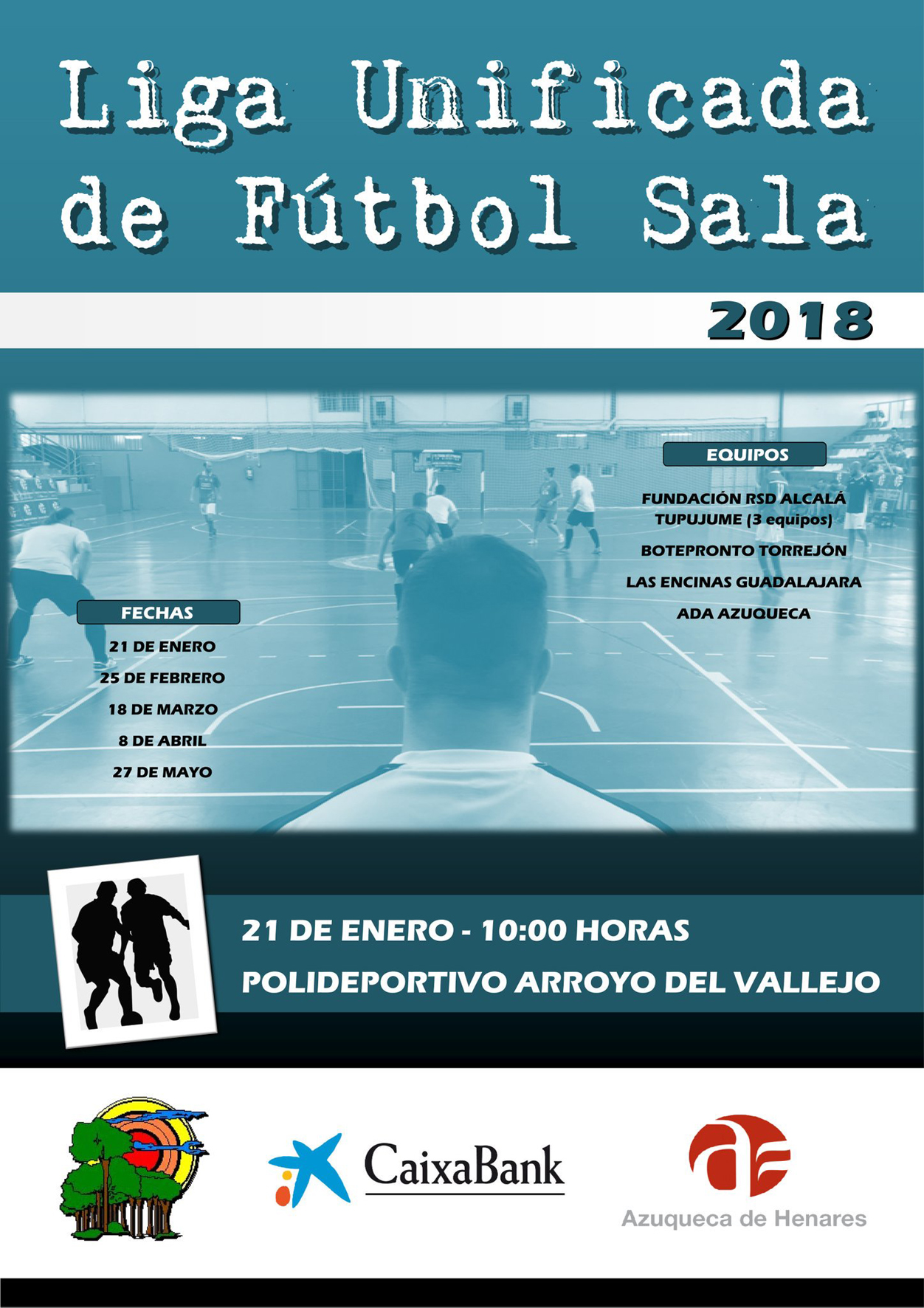 Este domingo, día 21, arranca la I Liga Unificada de Fútbol Sala organizada por el Ayuntamiento de Azuqueca de Henares y ADA, con el apoyo de la Obra Social de CaixaBank. El concejal de Deportes, Sergio de Luz, recuerda que "en diciembre de 2016, se celebró un torneo en una sola jornada y, ante la magnífica acogida que tuvo y, teniendo muy en cuenta las inquietudes de los participantes en el equipo de ADA en las Escuelas Municipales, este año se da un paso más y la competición se convierte en liga".El deporte unificado congrega en un mismo equipo a jugadores con y sin discapacidad intelectual, de manera que comparten juego, normas y valores. En esta liga, cada uno de los seis equipos participantes cuenta con un jugador sin discapacidad intelectual, que no puede marcar gol y que lleva un distintivo para facilitar su identificación. "Esta competición que incorporamos a la agenda deportiva de Azuqueca pretende avanzar en la normalización, la igualdad y la inclusión, en este caso a través de la práctica del deporte, y más en concreto del fútbol sala", añade De Luz.La liga comienza este domingo, a las 10 horas, en el polideportivo Arroyo del Vallejo. El resto de jornadas, que también se van a disputar en Azuqueca, se celebrarán el 25 de febrero, el 18 de marzo, el 8 de abril y el 27 de mayo. Los equipos que participan son, además de ADA, un conjunto de la asociación Las Encinas de Guadalajara, el Botepronto de Torrejón y tres conjuntos de la Fundación RSD Alcalá Tupujume.