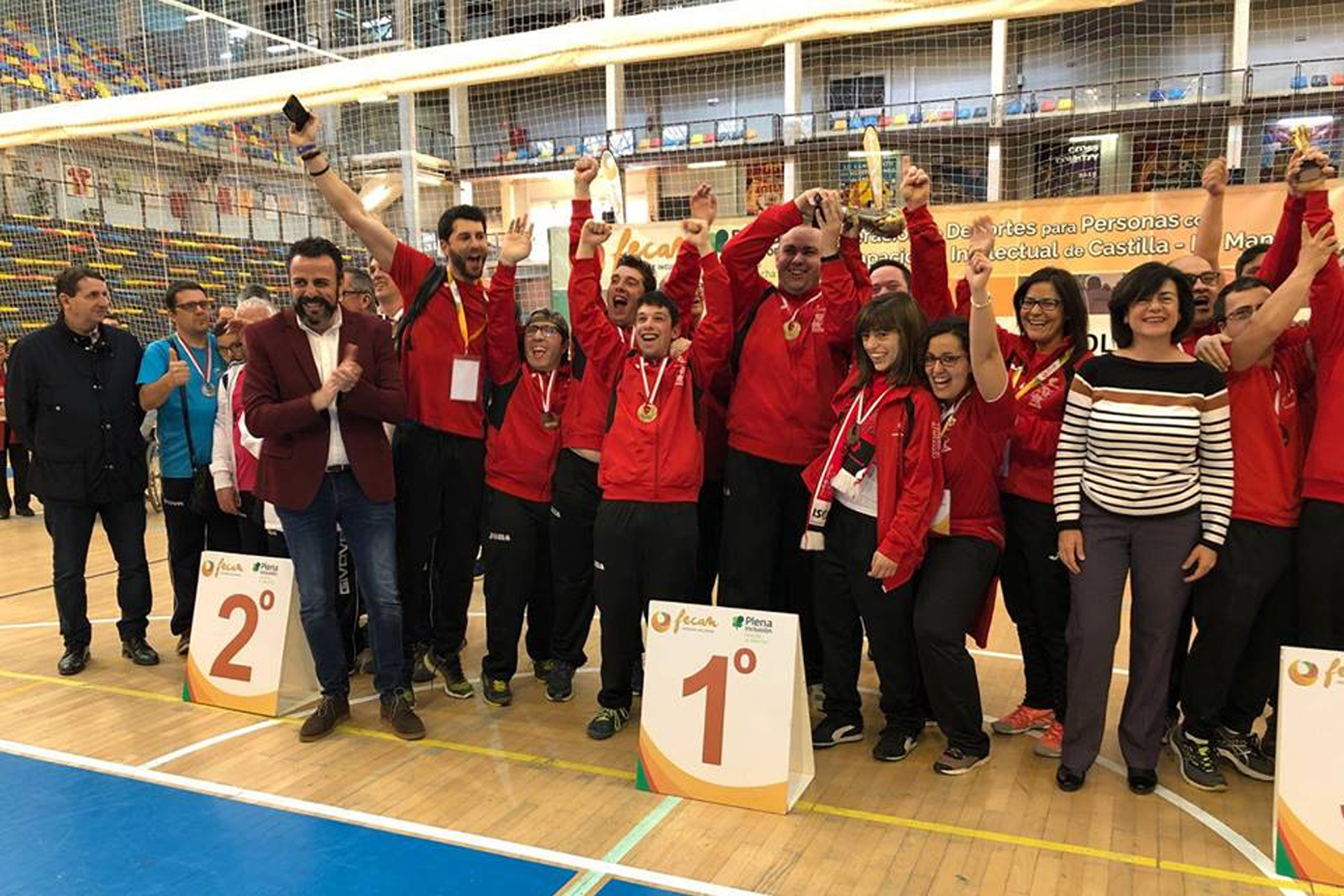 El Club Deportivo ADA (Asociacion de Padres, Familiares y Amigos de Personas con Discapacidad Intelectual y/o Desarrollo de Azuqueca) se ha impuesto en el Campeonato Regional de Fútbol Sala de FECAM (Federación de Deportes para Personas con discapacidad intelectual de Castilla-La Mancha), celebrado en Guadalajara los días 14 y 15 de abril. El conjunto local ha logrado el ascenso a Primera División después de ganar los tres partidos disputados sin encajar ningún gol.El alcalde azudense, José Luis Blanco, ha felicitado al CD ADA por este título y ha destacado su "trabajo ejemplar". "Este Ayuntamiento apuesta por la igualdad de todos los colectivos en todos sus ámbitos y el deporte es una herramienta que facilita la inclusión", ha añadido. "Estamos muy orgullosos de los chicos y chicas de ADA, que con apoyo familiar y profesional, esfuerzo e ilusión están logrando romper muchas barreras", ha afirmado. En este sentido, el primer edil ha recordado que cuatro jóvenes de ADA están realizando este curso un programa formativo INSOLAB en la Universidad de Alcalá de Henares y que la asociación cuenta con proyectos para la inserción laboral, de ocio y el fomento de la autonomía personal.El Campeonato Regional de Fútbol Sala de FECAM ha reunido en el Palacio Multiusos de Guadalajara a 120 deportistas de nueve clubes de las cinco provincias de Castilla-La Mancha. Según ha anunciado el alcalde, Azuqueca acogerá la próxima edición.Apoyo del Basket AzuquecaEntre otras muestras de apoyo, la charanga El Conejo de la Loles animó al conjunto local en sus partidos y, además, varios jugadores del Isover Basket Azuqueca presenciaron alguno de los partidos. Además, el equipo de EBA rindió homenaje a los campeones de ADA en el encuentro del domingo 15 de abril, cuando los rojinegros se midieron al CD Estudio, que se impuso en el polideportivo La Paz por 77 a 81.