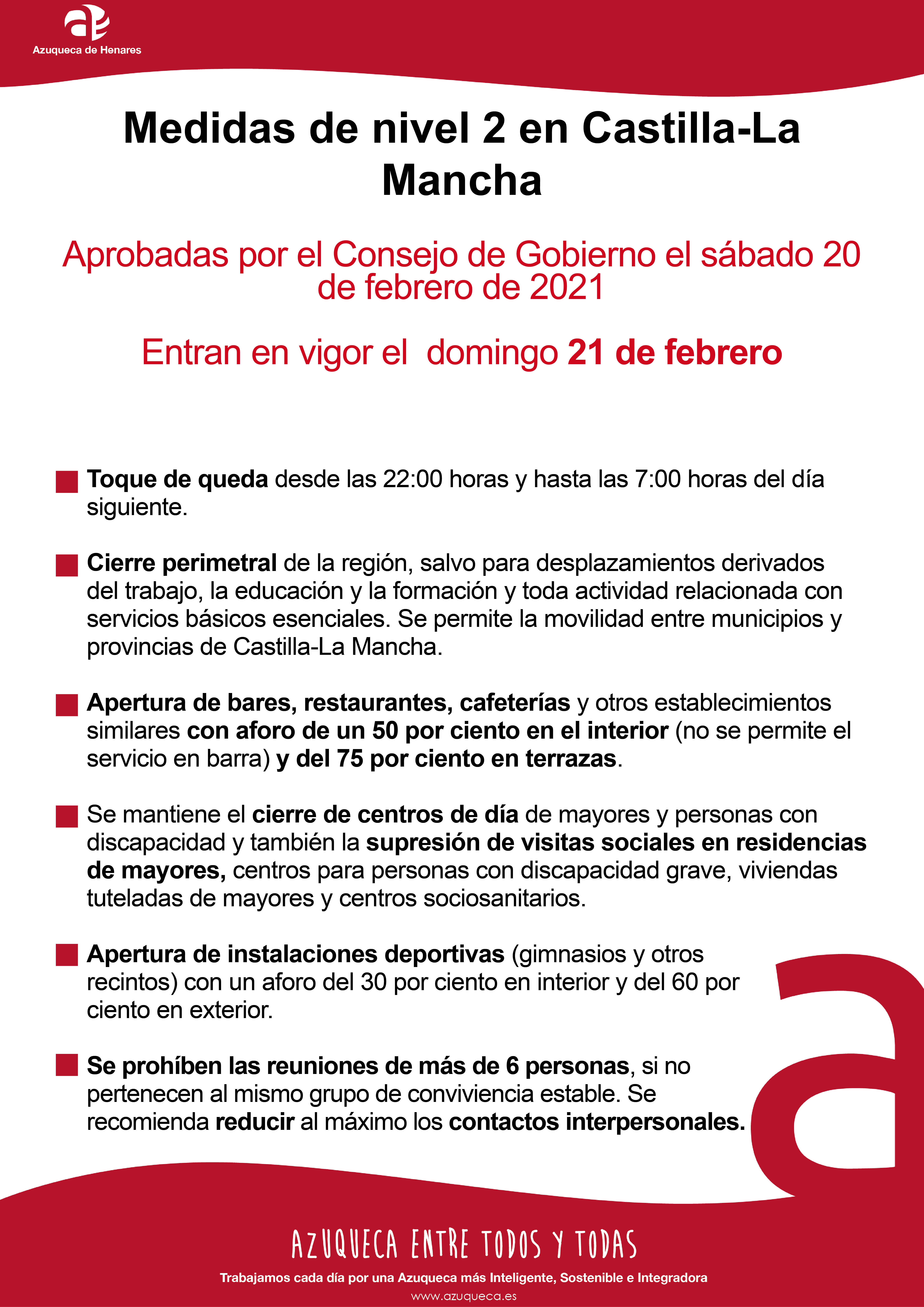 El Gobierno de Castilla-La Mancha ha acordado este sábado, en el transcurso de un Consejo de Gobierno extraordinario, rebajar, a partir de esta noche a Nivel 2 las medidas para el control de la expansión de la COVID-19, ante la evolución positiva, en claro descenso, de los datos epidemiológicos. Según los datos publicados ayer, en Azuqueca de Henares se han registrado 61 casos entre el 8 y el 14 de febrero, frente a los 111 de la semana anterior.En la provincia de Guadalajara, los municipios se Villanueva de la Torre, El Casar y Sigüenza se mantendrán en nivel 3 por la alta incidencia de casos.La Junta mantiene, no obstante, el toque de queda de 22 a 7 horas y también el cierre perimetral de la región, así como el cierre nocturno de parques (de 22 a 8 horas). Quedan prohibidas las reuniones de más de 6 personas, en caso de que no pertenezcan al mismo grupo de conviviencia estable.