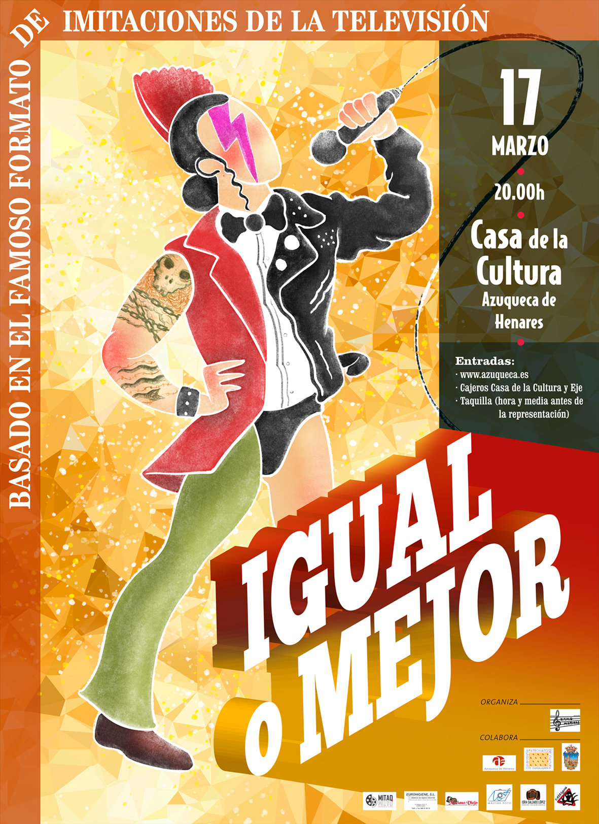 La Casa de la Cultura de Azuqueca de Henares acoge este sábado, 17 de marzo, a partir de las 20 horas, la representación de 'Igual o mejor', un montaje para toda la familia a cargo de la Asociación Ritmo Musical. Las entradas cuestan 4 euros con Tarjeta Ciudadana y 6 euros, sin este documento municipal. Se pueden adquirir de manera anticipada en esta página web (pinche AQUÍ) y en los cajeros ciudadanos. Además, el mismo sábado, se ponen a la venta en taquilla, a partir de las 18:30 horas.'Igual o mejor' es un musical basado en un conocido programa de imitaciones de la televisión. El jurado y el público votarán para elegir la mejor actuación, que combina maquillaje, vestuario, coreografía, música y proyecciones.Cuentos y cine