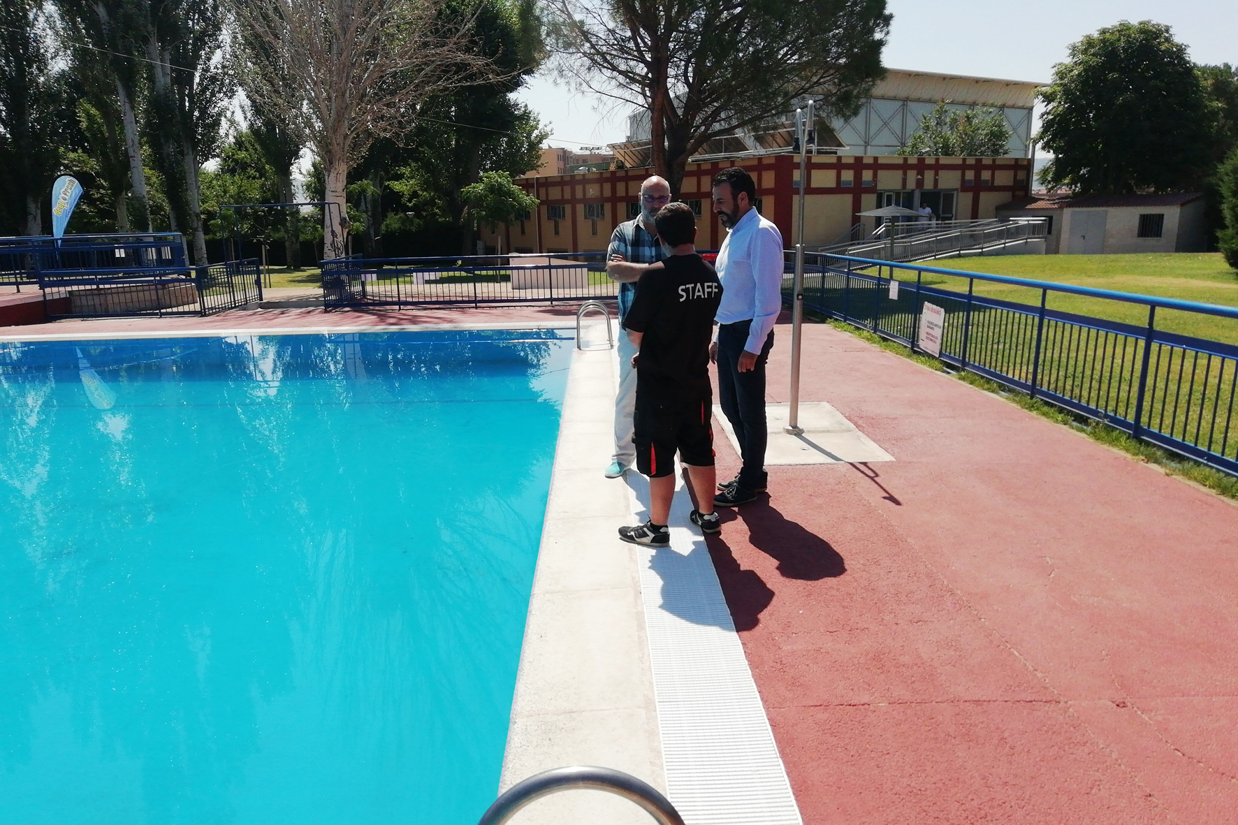 El alcalde de Azuqueca de Henares, José Luis Blanco, y el concejal de Urbanismo, Juan Pablo Román, han visitado de nuevo este lunes, 23 de julio, las instalaciones de la piscina de verano del complejo deportivo San Miguel, donde han podido comprobar que el vaso olímpico ya está recuperando la normalidad después de la alteración registrada la semana pasada en suelo y paredes. "Desde el Ayuntamiento, hemos exigido a la empresa adjudicataria del servicio de mantenimiento de estas instalaciones un refuerzo de la limpieza para acabar con esa alteración y poder ofrecer a nuestros vecinos y vecinas un vaso en las mejores condiciones posibles", señala el primer edil.Juan Pablo Román, por su parte, ha querido lanzar un mensaje de tranquilidad. "A finales de la semana pasada, la Dirección Provincial de Sanidad realizó una inspección rutinaria en la piscina de verano en la que estableció que la calidad del agua era correcta", explica, al tiempo que añade que "cada día, se llevan a cabo tres controles de la calidad del agua y el pH no se ha visto alterado en ningún momento, por lo que las condiciones para el baño han sido y son óptimas".