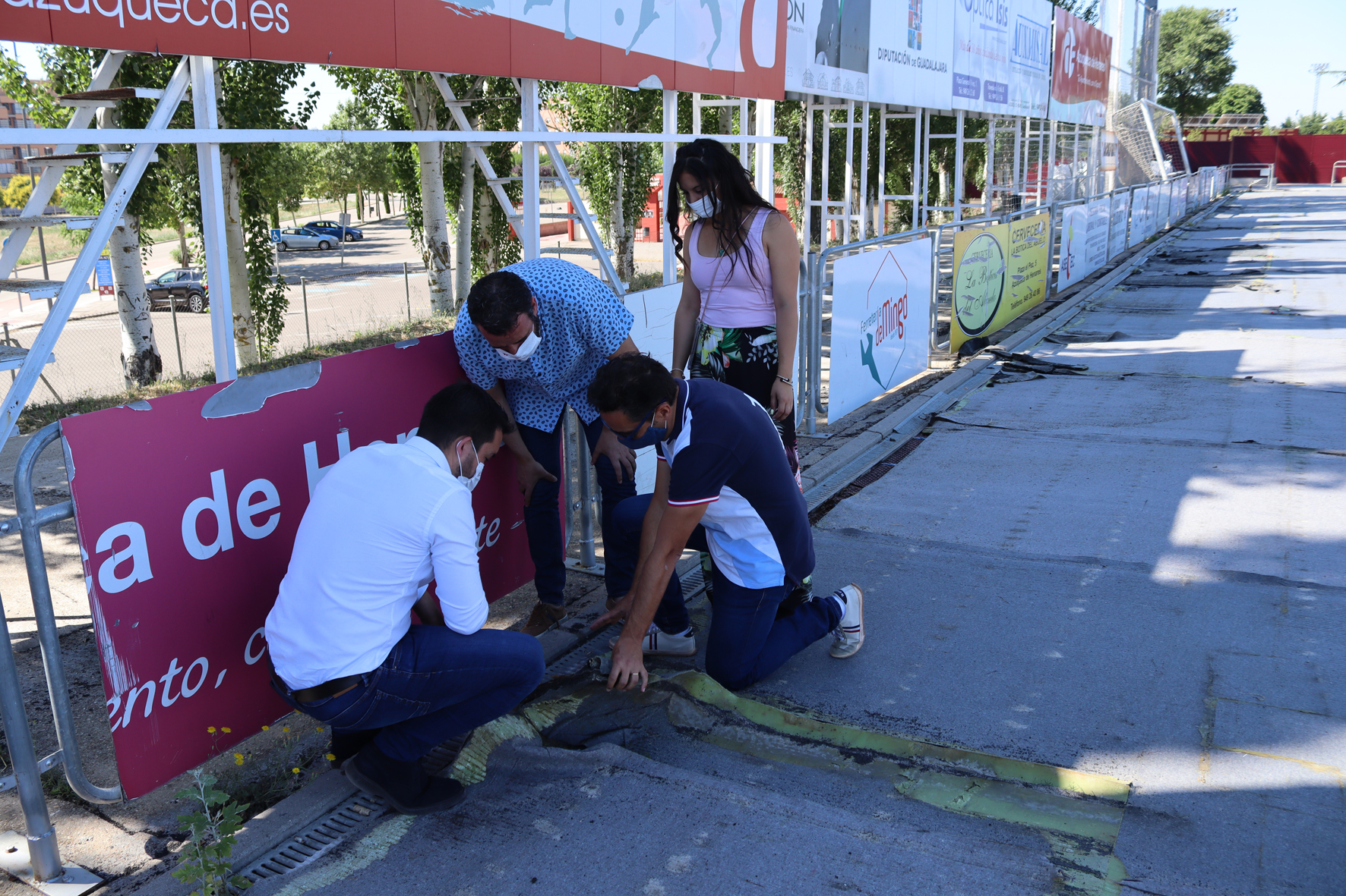 Desde hace unos días, se están ejecutando las obras programadas por el Ayuntamiento de Azuqueca de Henares en el campo de fútbol 11 del complejo deportivo San Miguel. Los trabajos fueron adjudicados a la empresa Mondo Ibérica S.A.U. y van a suponer la renovación del pavimento deportivo y la instalación de porterías abatibles de fútbol 7. Este viernes, el alcalde, José Luis Blanco, acompañado del edil del Retos Deportivos, Enrique Pérez de la Cruz, y la coordinadora del Equipo de Gobierno, Susana Santiago, ha visitado el campo, donde el técnico municipal de Deportes les ha explicado la evolución de los trabajos."Se va a poner nuevo césped artificial, y cuatro nuevas porterías abatibles para la práctica de fútbol 7", recuerda el concejal de Retos Deportivos, que añade que "también se hará el marcaje de un campo de fútbol-11 y dos campos de fútbol-7, según la reglamentación exigida por la Real Federación Española de Fútbol".