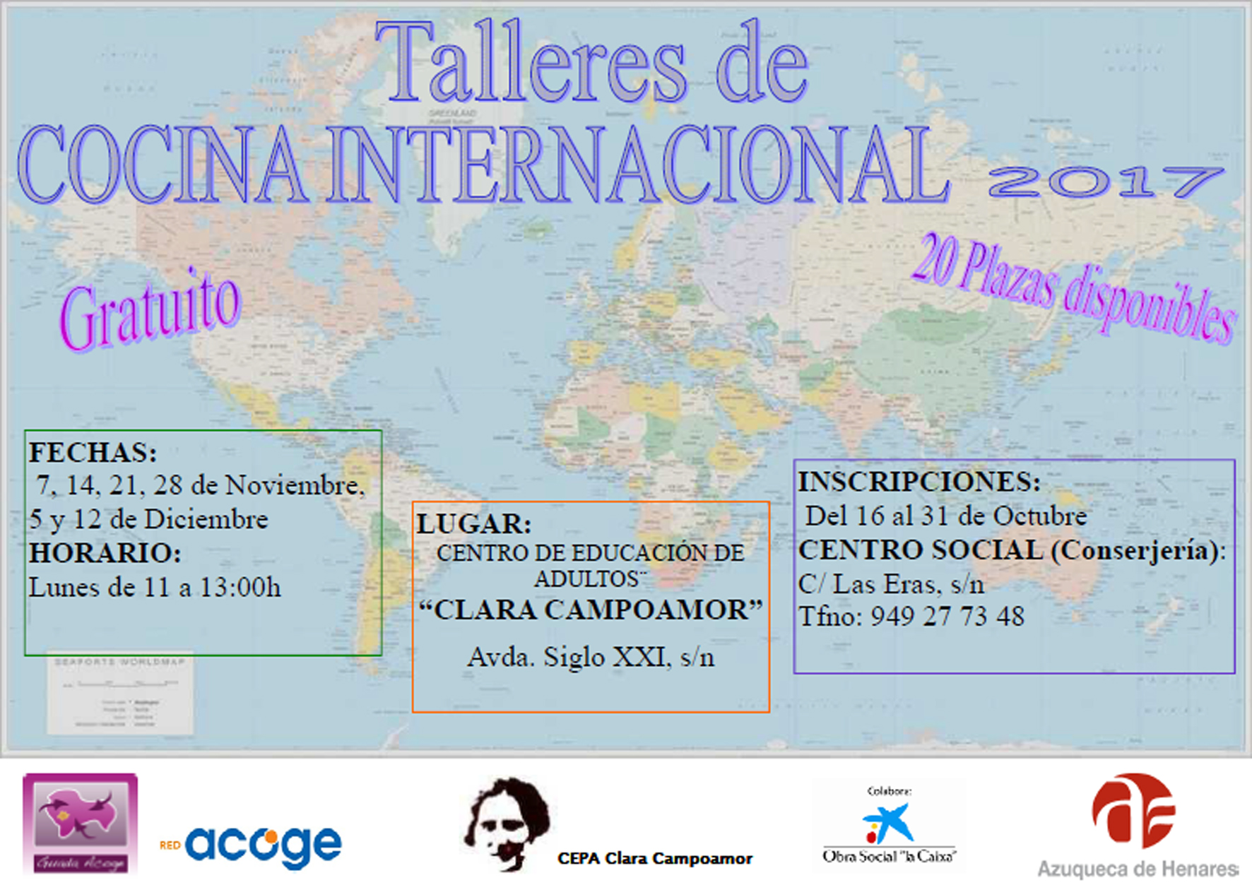 El Ayuntamiento de Azuqueca de Henares y Guada Acoge organizan una nueva edición del taller de Cocina Internacional. Las sesiones, que tendrán lugar en las instalaciones del CEPA Clara Campoamor, se impartirán por las mañanas, de 11 a 13 horas, los martes 7, 14, 21 y 28 de noviembre y continuarán los días 5 y 12 de diciembre.