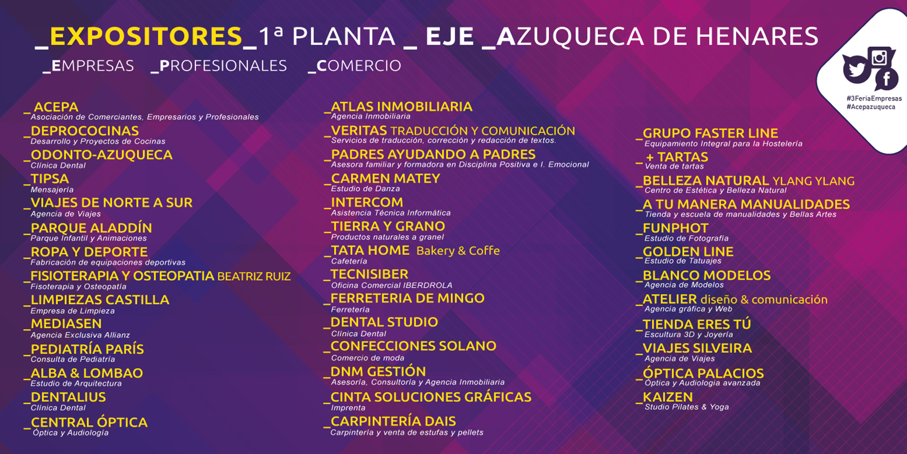 En las instalaciones del Espacio Joven Europeo (EJE) se celebra este fin de semana la III Feria de Profesionales y Empresas de Azuqueca. El sábado 27 de 11 a 20 horas y el domingo 28 de 11 a 18 horas, los participantes promocionarán sus actividades, productos y los servicios que prestan. En total, la feria contará con 40 participantes que dispondrán de expositor, más otros cuatro colaboradores adicionales. La concejala de Comercio, Sagrario Bravo, recuerda que el objetivo de esta propuesta, incluida en el acuerdo de colaboración entre el Ayuntamiento de Azuqueca de Henares y ACEPA (Asociación de Comerciantes, Empresarios y Profesionales de Azuqueca), es "exactamente el mismo que en las dos ediciones anteriores: ofrecer un espacio para que los participantes se den a conocer y, al tiempo, facilitar las relaciones y los intercambios entre los propios profesionales y empresas que participan". La inauguración oficial de la feria y la apertura de puertas se ha previsto a las 11 de la mañana del sábado. Durante las dos jornadas, se han programado distintas actividades y ponencias y, para facilitar la visita a las familias, el sábado de 12 a 14 horas y de 18 a 20 h., y el domingo, de 12 a 14 h. y de 16 a 18 h., habrá talleres infantiles con monitores. Entre las conferencias, destaca la presencia el sábado 27, a las 16 horas, de Valeria Domínguez, de la firma Adolfo Domínguez, que hablará sobre 'El nuevo lujo. Las 10 claves del éxito online'. Para despedir la feria, el domingo, a las 17:30 horas, en el expositor de ACEPA, se celebrará un sorteo de premios.Sucesión en las PymesComo anticipo de la Feria, el viernes 26, a las 20:30 horas, se celebrará una mesa participativa en la sala de cine del EJE, titulada 'Sucesión en la Pyme familiar. Empresas de segunda y tercera generación'. Participarán representantes de cinco empresas de Azuqueca se segunda y tercera generación, que expondrán sus experiencias.Tanto la entrada a la mesa participativa del viernes como al conjunto de la feria el sábado y el domingo es gratuita.
