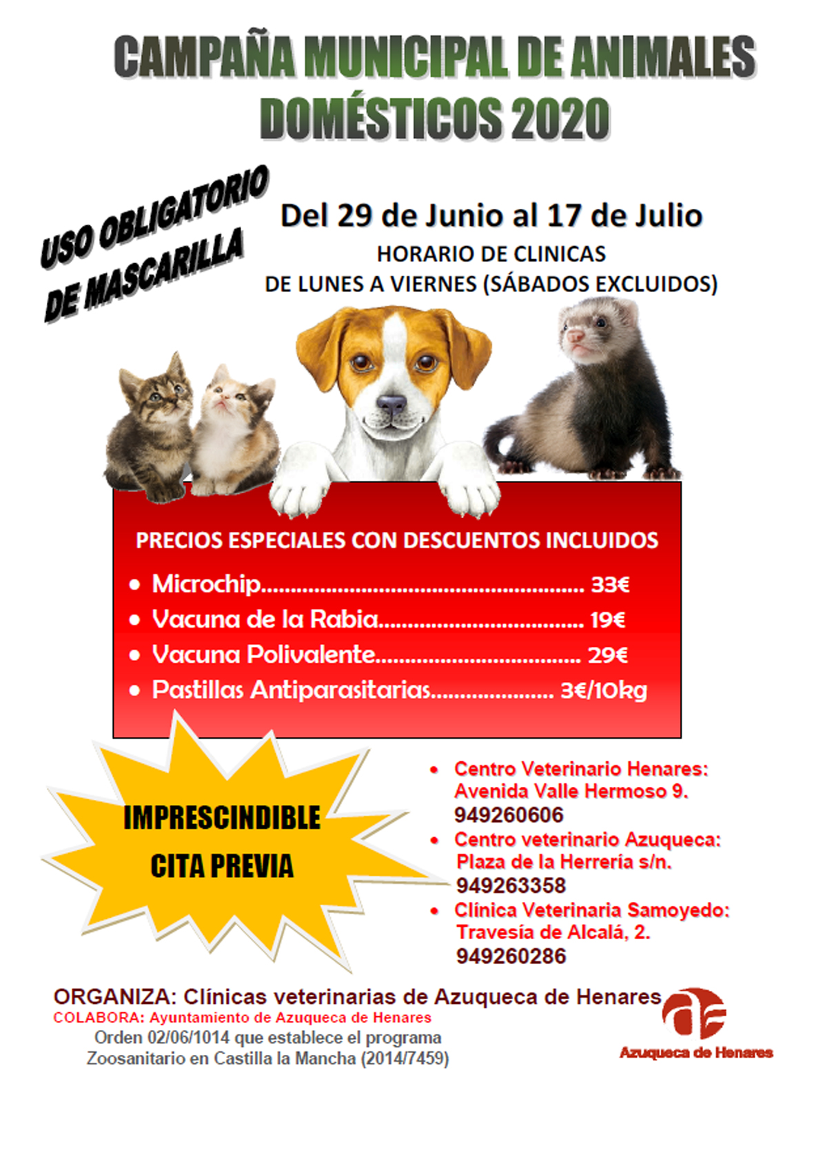 Desde este lunes, 29 de junio, y hasta el 17 de julio, se desarrolla la campaña municipal de animales domésticos 2020 que organizan las clínicas veterinarias de Azuqueca de Henares con la colaboración del Ayuntamiento. "Se trata de una medida con la que se pretende que las y los propietarios de mascotas de Azuqueca puedan cumplir con la normativa vigente en esta de vacunación, identificación y desparasitación", recuerda la concejala de Desarrollo Saludable, Charo Martín.La campaña se ha adaptado a la 'nueva normalidad' y el uso de mascarilla es obligatorio. Además, es imprescindible solicitar cita previa el servicio se va a prestar de lunes a viernes (sábados excluidos) según el horario de las clínicas participantes.Los precios, con descuentos incluidos, son los siguientes: 33 euros, para la colocación del microchip; 19 euros, para la vacuna de la rabia; 29 euros, para la vacuna polivalente y las pastillas antiparasitarias cuestan 3 euros por cada 10 kilos de peso.Clínicas- Centro Veterinario Henares: avenida de Vallehermoso, 9. Teléfono: 949 260 606.- Centro Veterinario Azuqueca: plaza de la Herrería, s/n. Teléfono: 949 263 358.- Clínica Veterinaria Samoyedo: travesía de Alcalá, 2. Teléfono: 949 260 286.