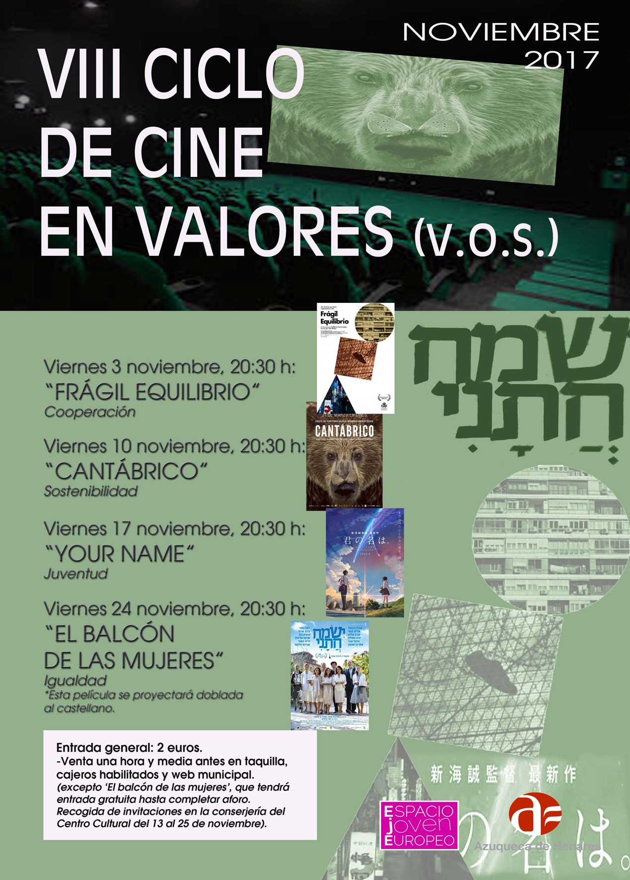 El ciclo comienza el día 3 con ‘Frágil equilibrio’ (Cooperación), ganadora del premio Goya al Mejor documental de 2016; el día 10, se podrá ver ‘Cantábrico’, la propuesta de Sostenibilidad; el viernes 17, ‘Your Name’ (Juventud), reconocida en el Festival de Sitges de 2016 con el premio al Mejor film de animación; y, por último, el día 24, se proyectará ‘El balcón de las mujeres’ (Igualdad), en el marco del programa municipal de los actos del 25 de Noviembre, Día Internacional contra la Violencia de Género. Para las tres primeras películas -que se proyectarán en versión original subtitulada-, el precio de las localidades es de 2 euros (venta anticipada AQUÍ y en los cajeros ciudadanos), mientras que para 'El balcón de las mujeres' se ha previsto acceso libre con invitación (disponibles desde el 13 de noviembre, por la mañana, en la conserjería de la Casa de la Cultura; el resto, el mismo día 24, desde las 19 horas, en la taquilla del EJE).