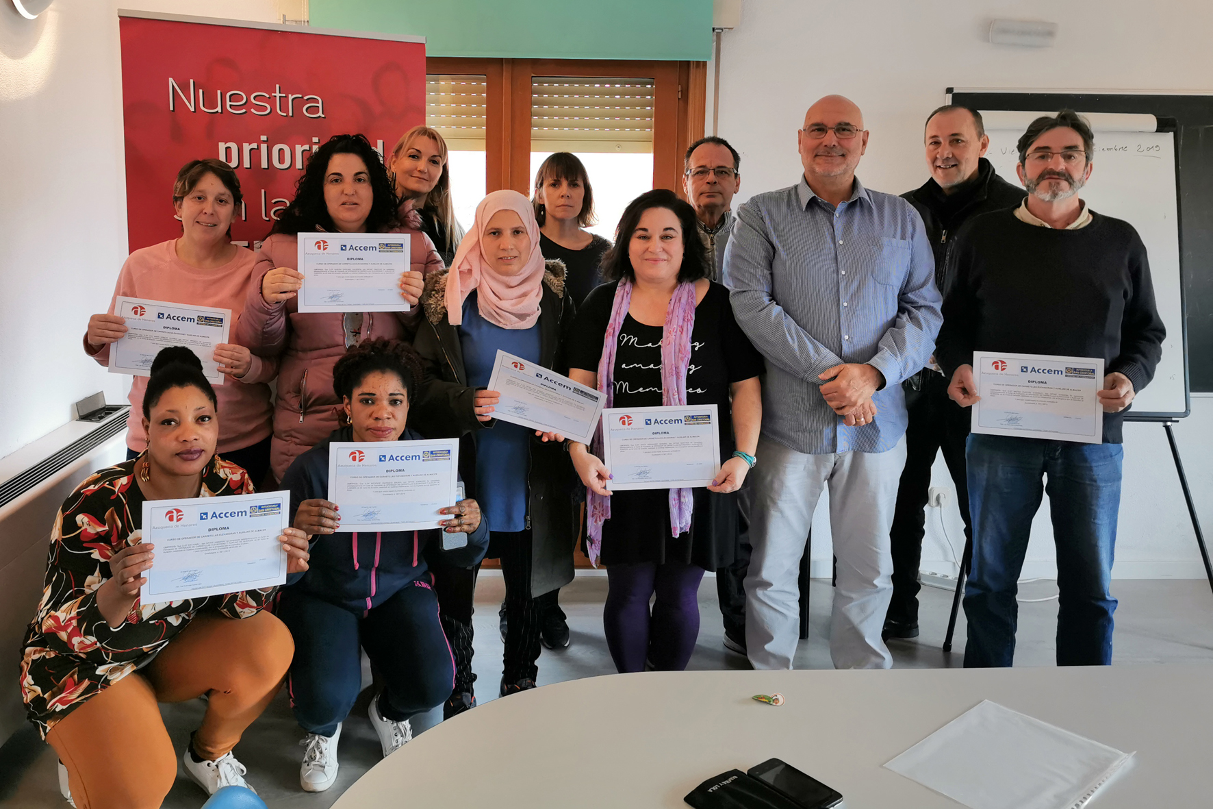 El curso 'Operador de carretillas elevadoras y auxiliar de almacén', que impulsa Accem en el marco del Programa Extraordinario por la Cohesión Social (PECS) del Ayuntamiento de Azuqueca de Henares, ha concluido con la entrega de diplomas al alumnado participante. "Esta formación se engloba en un proyecto de inserción laboral que desarrolla Accem en nuestra ciudad y que se dirige a personas mayores de 30 años de edad en situación o en riesgo de exclusión social y con dificultades para acceder al mercado laboral", explica el concejal de Derechos y Libertades, David Pinillos, quien recuerda que el proyecto ha contado este año con una subvención municipal de 40.726 euros. Entregó los diplomas el concejal de Europa, Juan Pablo Román, responsable del área de Empleo en el Ayuntamiento."Los participantes son derivados por los Servicios Sociales Municipales y, a través de este proyecto, se pretende mejorar sus competencias de empleabilidad", señala el edil. "Para cada persona, se establece un itinerario personalizado e individual de orientación", detalla. "Tras una primera fase de acogida y diagnóstico, se plantean las necesidades y carencias del usuario y se establecen las habilidades sociales, laborales y de capacitación profesional que se deben abordar, porteriormente se enseñan las herramientas para la búsqueda de empleo con el uso de las nuevas tecnologías y se trabajan las habilidades mencionadas y, por último, se completa con una formación en un sector con demanda en nuestra ubicación, el Corredor del Henares", detalla David Pinillos.
