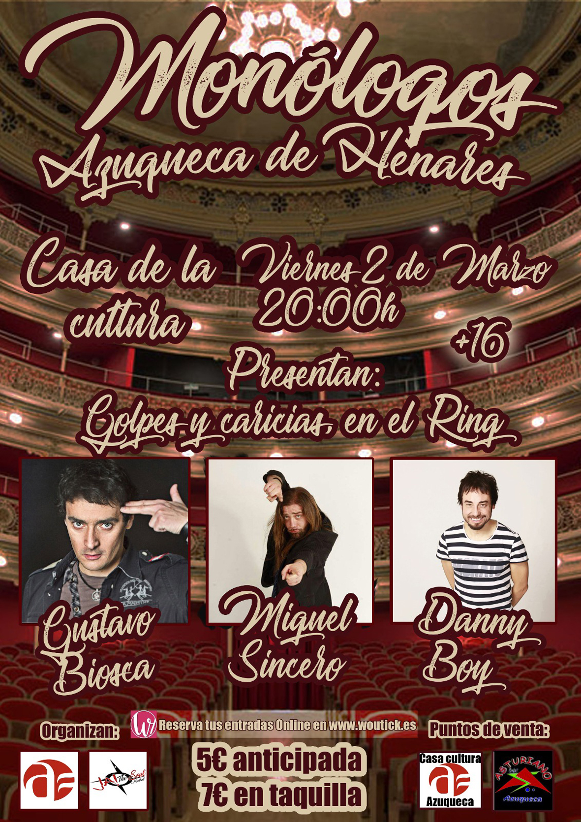 Los monólogos vuelven este viernes, 2 de marzo, a la Casa de la Cultura de Azuqueca de Henares con el espectáculo titulado 'Golpes y caricias en el ring', a cargo de los cómicos Gustavo Biosca, Miguel Sincero y Danny Boy. La sesión comienza a las 20 horas y se dirige a mayores de 16 años. Las entradas cuestan 5 euros en venta anticipada (están disponibles en la página web www.woutick.es, en la Casa de la Cultura y el Bar Asturiano) y 7 euros en taquilla.Por otra parte, la sala de cine del Espacio Joven Europeo (EJE) acoge este fin de semana la proyección de tres películas. El viernes 2, a las 20:30 horas, la cinta 'Grandma' abre el Ciclo de Cine y Mujer, que se va a desarrollar a lo largo del mes de marzo y contempla cuatro títulos más: 'Paula' (día 9, entrada gratuita por el Día Internacional de las Mujeres), 'Doña Clara' (día 16), 'Maudie' (día 23) y 'El porvenir' (día 30).En la cartelera comercial, se puede ver 'Bonnie Bears y el gran secreto' (todos los públicos), el sábado 3 y domingo 4 de marzo, a las 18 horas, y 'El gran showman' (todos los públicos), el viernes 2, a las 18 horas y el sábado y el domingo, a las 21 horas.Las entradas del cine cuestan, con Tarjeta Ciudadana, 3 euros para los adultos y 2 euros para los niños y, sin este documento municipal, 3,80 y 2,45 euros, respectivamente. Se pueden adquirir de manera anticipada en esta web -pinche AQUÍ- y en los cajeros ciudadanos, o bien, en taquilla, una hora y media antes del inicio del pase.'Que aflore lo enterrado. El fuerte de San Cristóbal'Además, hasta el 7 de marzo, la sala de exposiciones de la Casa de la Cultura acoge la muestra 'Que aflore lo enterrado. El fuerte de San Cristóbal', que impulsa la asociación Txinparta y miembros de la Recuperación de la Memoria Histórica. Según se explica desde la organización, 7.000 presos fueron encarcelados por Franco en el Fuerte de San Cristóbal (Pamplona), también llamado el 'Auszwitch' español, donde murieron más de 700 republicanos.
