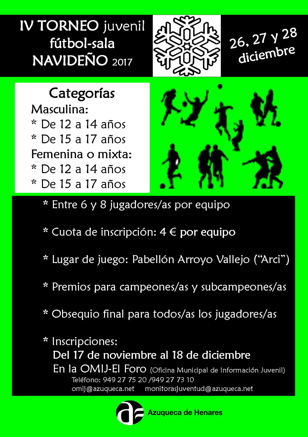 El Ayuntamiento de Azuqueca de Henares organiza el cuarto Torneo de Fútbol Sala Navideño para jóvenes con edades comprendidas entre los 12 y los 17 años. La actividad tendrá lugar en el polideportivo Arroyo del Vallejo los días 26, 27 y 28 de diciembre.
