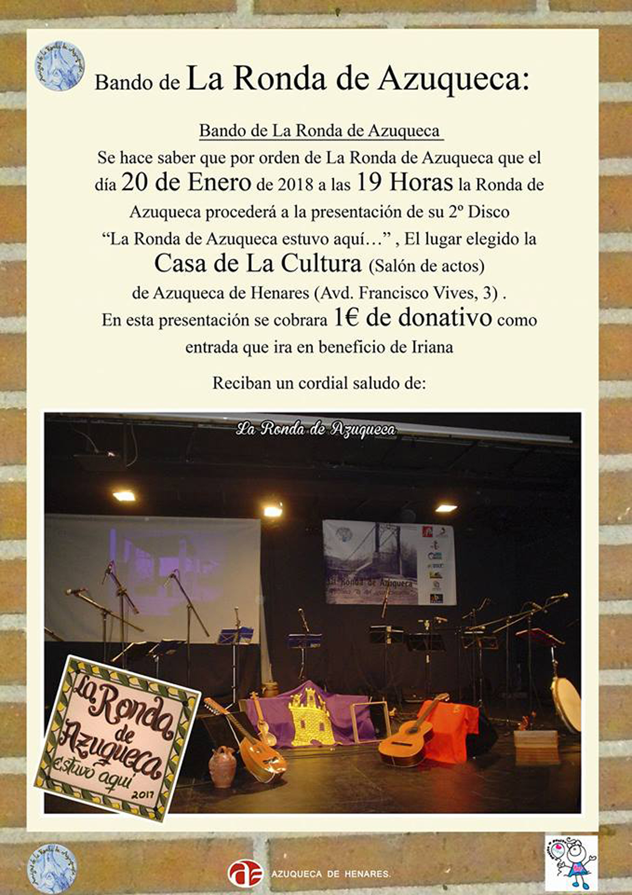 La Ronda de Azuqueca presenta este sábado en el salón de actos de la Casa de la Cultura su segundo disco. Titulado 'La Ronda de Azuqueca estuvo aquí...', el CD -del que se han editado un millar de copias- incluye 16 temas grabados en los estudios KMC de Madrid. El Ayuntamiento de Azuqueca de Henares es uno de los patrocinadores de este trabajo, que presentarán los integrantes de la Ronda en un concierto a las 19 horas de este sábado. A la entrada se cobrará un euro de donativo por persona para colaborar con la asociación 'Iriana pasito a pasito'.CineLa oferta de cine del EJE incluye para este viernes una nueva entrega del ciclo de cine 'Racismo' con 'Loving', a partir de las 20:30 horas. La cartelera comercial ofrece 'Wonder' (viernes, sábado y domingo, a las 18 horas) y 'La librería' (sábado y domingo, a las 21 horas). El precio de las localidades es, para los espectadores con Tarjeta Ciudadana, de 3 euros (adultos) y 2 euros (niños) y, para quienes no tengan este documento municipal, 3,80 y 2,45 euros, respectivamente. Las entradas se pueden adquirir a través de esta web (AQUÍ), en los cajeros ciudadanos, o bien, el mismo día de las proyecciones, en taquilla, una hora y media antes. Premios TaurinosPor otra parte, este viernes se entregan en el Centro de Ocio Río Henares, a las 19:30 horas, los premios de la Feria Taurina celebrada en las pasadas fiestas de septiembre en Azuqueca. En esta edición, el premio al Mejor Novillero ha sido para David Garzón; Fuenterroble recibe el galardón a la Mejor Ganadería y el premio al Mejor Novillo es para el astado número 9, Riojano, que fue lididado el 23 de septiembre, en sexto lugar del festejo.Mercado de la TierraComo cada tercer sábado de mes, se celebra el Mercado de la Tierra de Azuqueca de Henares. De 10 a 15 horas, se instalarán en el parque de La Constitución los venderores de productos locales, de kilómetro 0 y artesanales.