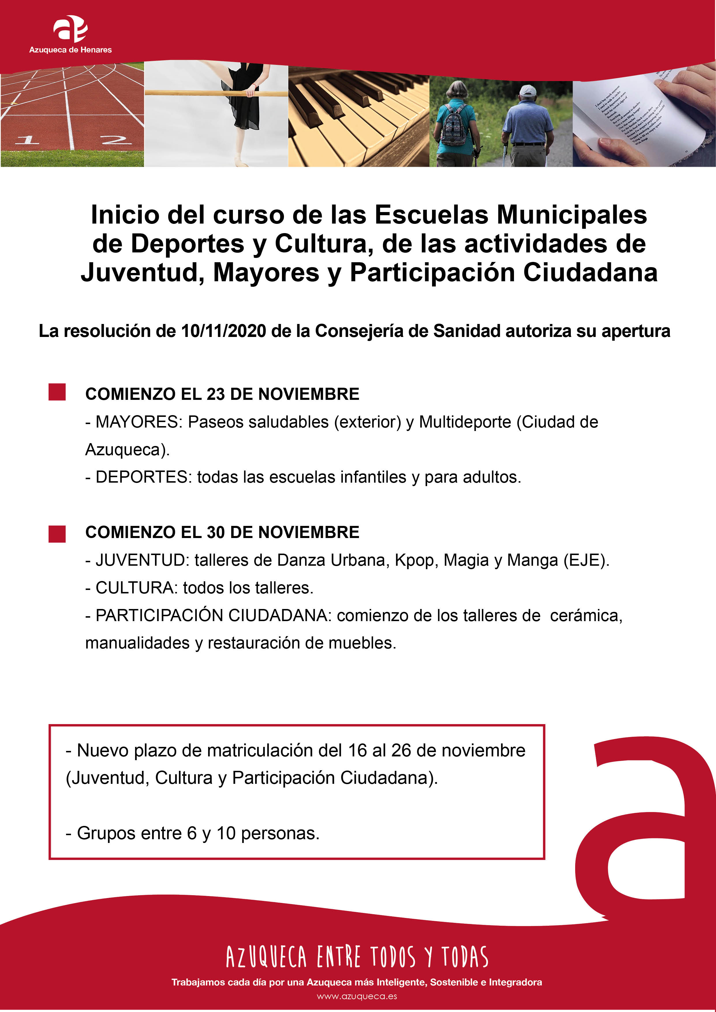El Ayuntamiento de Azuqueca de Henares ultima los preparativos para iniciar el curso en las escuelas municipales de Deportes y Cultura, en actividades de Juventud, Participación Ciudadana y Mayores. La primera teniente de alcalde y coordinadora del equipo de gobierno, Susana Santiago, recuerda que la resolución de Sanidad del 23 de agosto establecía la suspensión de la actividad de las escuelas municipales de deportes, música, danza, pintura, idiomas, entre otras determinaciones. "En sucesivas resoluciones, esa suspensión se ha mantenido, hasta que el 10 de noviembre, la consejería de Sanidad del gobierno regional autoriza la reanudación de estas actividades", explica Santigo, que recuerda que durante el verano, el Ayuntamiento preparó nuevos espacios, con el fin de garantizar la distancia de seguridad. Siguiendo este objetivo, las propuestas de artes plásticas se desarrollarán este curso en El Foro, en la calle Ciudad Real, mientras que las artes escénicas se van a repartir entre la Casa de la Cultura y el Espacio Joven Europeo (EJE). Susana Santiago ha explicado que "los grupos estarán limitados a 6 o 10 personas, en función de las características de cada actividad". Para dar opción a que se incorporen las personas interesadas que no hubieran hecho la inscripción en su momento, se abre un nuevo plazo de matriculación del 16 al 26 de noviembre, para las propuestas de Juventud, Cultura y Participación Ciudadana. Más información, AQUÍ.Calendario de inicio Las primeras actividades que vuelven a funcionar, desde el 23 de noviembre, son todas las escuelas municipales de Deportes y dos propuestas para personas mayores: los paseos saludables que se llevan a cabo en recorridos exteriores por la ciudad y el multideporte, en el polideportivo Ciudad de Azuqueca. El lunes siguiente, día 30, se iniciará el curso de todos los talleres de Cultura y Juventud, así como de Participación Ciudadana (cerámica, manualidades y restauración de muebles).Se retrasa hasta el mes de enero el inicio de los cursos dirigidos a personas mayores. Susana Santiago recuerda que, en todo momento, las actividades deberán adaptarse a las circunstancias sanitarias y a las medidas establecidas por la autoridad sanitaria, en función de la evolución de la pandemia.